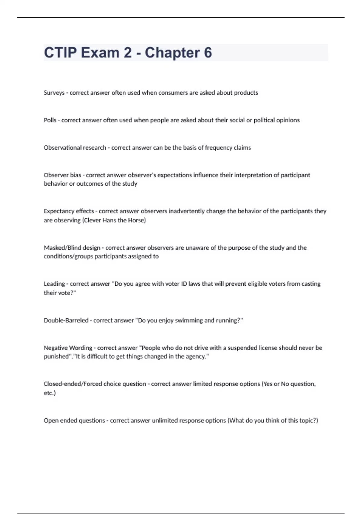 CTIP Exam 2 - Chapter 6 Surveys - correct answer often used when consumers are asked about products Polls - correct answer often used when people are asked about their social or political opinions Observational research - correct answer can be the basis of frequency claims Observer bias - correct answer observer's expectations influence their interpretation of participant behavior or outcomes of the study Expectancy effects - correct answer observers inadvertently change the behavior of the participants they are observing (Clever Hans the Horse) Masked/Blind design - correct answer observers are unaware of the purpose of the study and the conditions/groups participants assigned to Leading - correct answer "Do you agree with voter ID laws that will prevent eligible voters from casting their vote?" Double-Barreled - correct answer "Do you enjoy swimming and running?" Negative Wording - correct answer "People who do not drive with a suspended license should never be punished"."It is difficult to get things changed in the agency." Closed-ended/Forced choice question - correct answer limited response options (Yes or No question, etc.) Open ended questions - correct answer unlimited response options (What do you think of this topic?) Semantic differential format - correct answer respondent asked to rate a target object using a numeric scale that is anchored with adjectives (Ex: Food rating 1=Rotten 5=Delicious) Graphic Rating Scale - correct answer nonverbal scales for children, labeling response alternatives (pain scale) Likert Scale - correct answer participants asked to use a rating scale to indicate their degree of agreement; Doesn't always have words, not ALWAYS strongly agree or disagree Response sets - correct answer a tendency to respond to survey questions from a particular perspective rather than answering directly Fence sitting - correct answer playing it safe by answering in the middle of the scale; Weakens construct validity ; use an even number of Q's so participant is forced to pick a side Acquiescence (Yea saying) - correct answer tendency to agree with everything a researcher asks Nay Saying - correct answer disagreeing with everything a researcher asks; Include questions for which consistent responses are unlikely Social desirability - correct answer the tendency to answer questions in the way that would reflect most favorably on the respondent