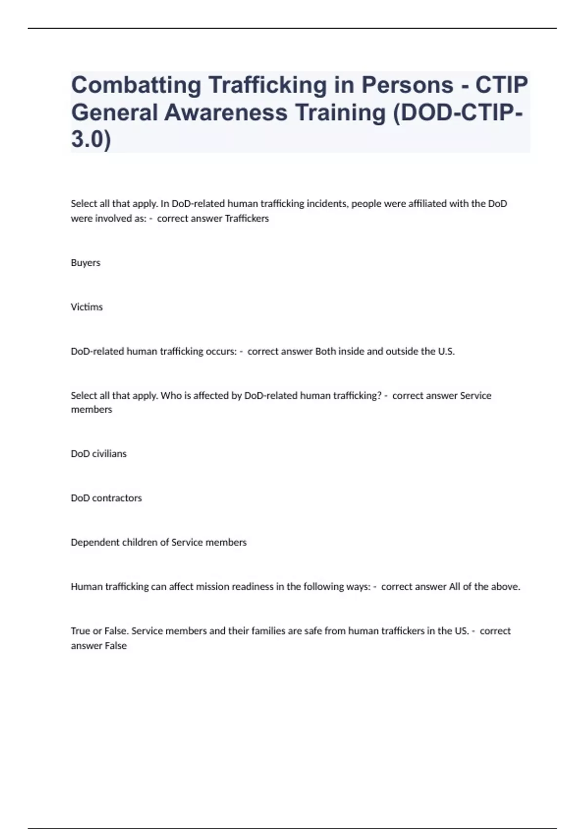 Combatting Trafficking in Persons - CTIP General Awareness Training (DOD-CTIP-3.0) fully solved graded A+