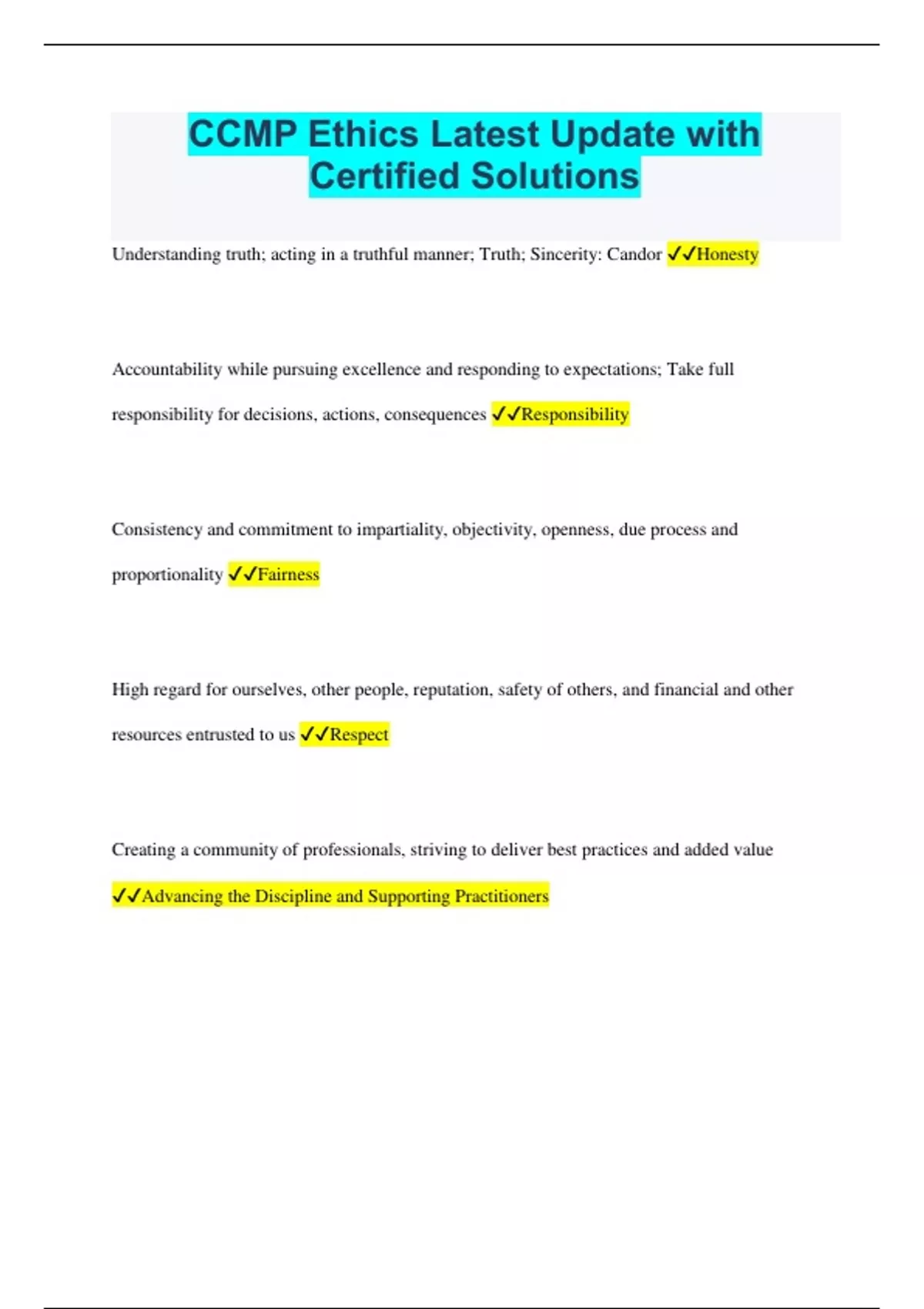 CCMP Ethics Latest Update with Certified Solutions Understanding truth; acting in a truthful manner; Truth; Sincerity: Candor Honesty Accountability while pursuing excellence and responding to expectations; Take full responsibility for decisions, actions, consequences Responsibility Consistency and commitment to impartiality, objectivity, openness, due process and proportionality Fairness High regard for ourselves, other people, reputation, safety of others, and financial and other resources entrusted to us Respect Creating a community of professionals, striving to deliver best practices and added value Advancing the Discipline and Supporting Practitioners