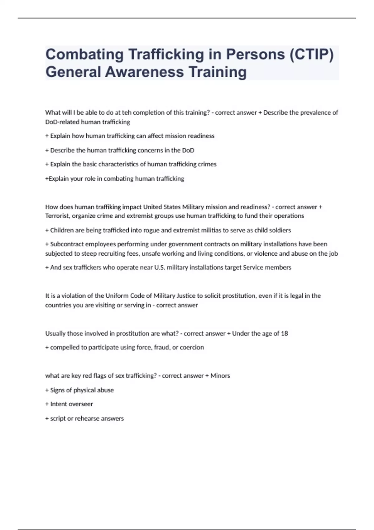 Combating Trafficking in Persons (CTIP) General Awareness TrainingWhat will I be able to do at teh completion of this training? - correct answer + Describe the prevalence of DoD-related human trafficking + Explain how human trafficking can affect mission readiness + Describe the human trafficking concerns in the DoD + Explain the basic characteristics of human trafficking crimes +Explain your role in combating human trafficking How does human traffiking impact United States Military mission and readiness? - correct answer + Terrorist, organize crime and extremist groups use human trafficking to fund their operations + Children are being trafficked into rogue and extremist militias to serve as child soldiers + Subcontract employees performing under government contracts on military installations have been subjected to steep recruiting fees, unsafe working and living conditions, or violence and abuse on the job + And sex traffickers who operate near U.S. military installations target Service members It is a violation of the Uniform Code of Military Justice to solicit prostitution, even if it is legal in the countries you are visiting or serving in - correct answer Usually those involved in prostitution are what? - correct answer + Under the age of 18 + compelled to participate using force, fraud, or coercion what are key red flags of sex trafficking? - correct answer + Minors + Signs of physical abuse + Intent overseer + script or rehearse answers What did you review on this course? - correct answer + Describe the prevalence of DoD-related human tracfficking + Explain how human trafficking can affect mission readiness + Describe the human trafficking concerns in the DoD + Explain the basic characterics of human trafficking crimes + Explain your role in combating huma= trafficking