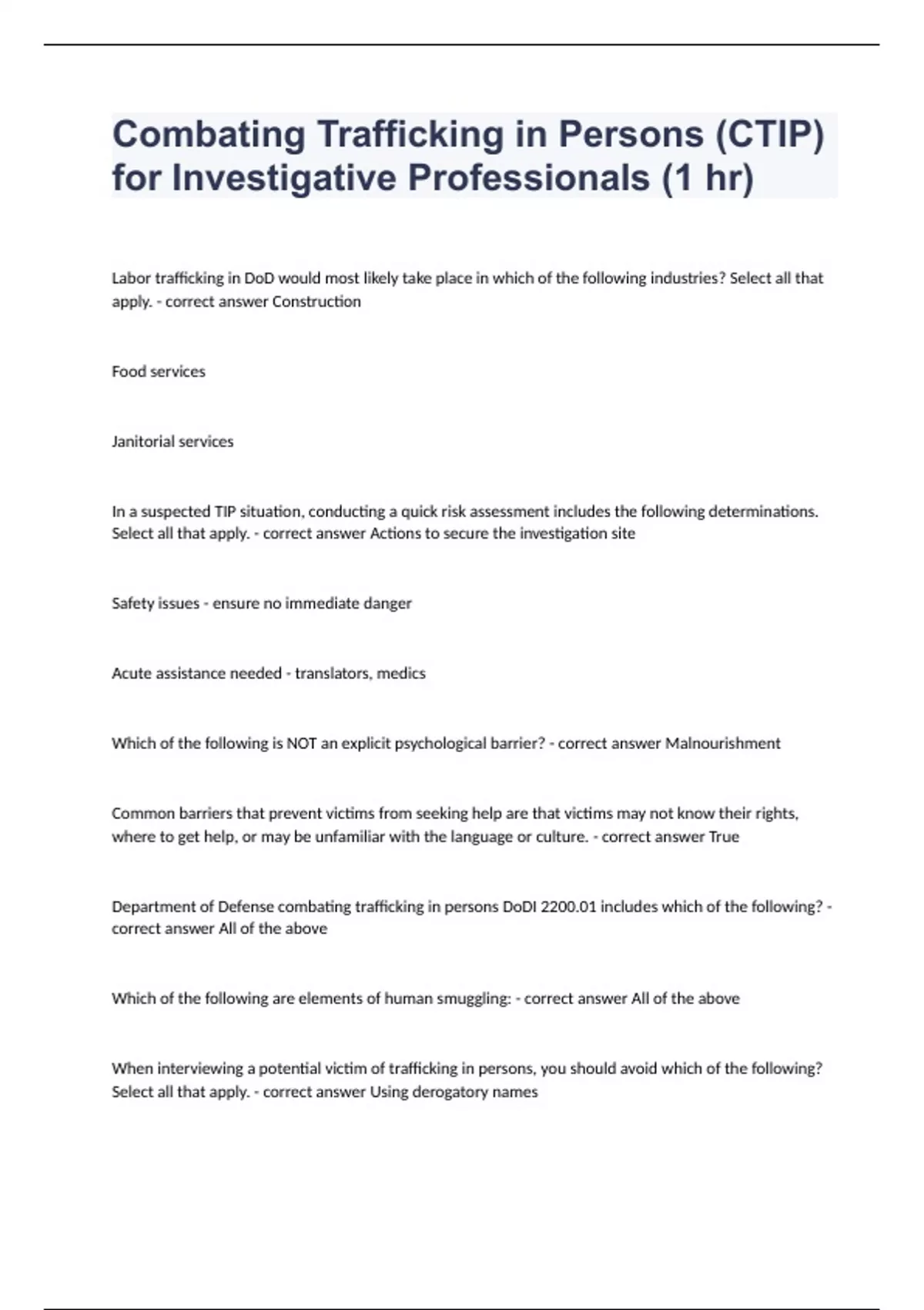 Combating Trafficking in Persons (CTIP) for Investigative Professionals (1 hr) Labor trafficking in DoD would most likely take place in which of the following industries? Select all that apply. - correct answer Construction Food services Janitorial services In a suspected TIP situation, conducting a quick risk assessment includes the following determinations. Select all that apply. - correct answer Actions to secure the investigation site Safety issues - ensure no immediate danger Acute assistance needed - translators, medics Which of the following is NOT an explicit psychological barrier? - correct answer Malnourishment Common barriers that prevent victims from seeking help are that victims may not know their rights, where to get help, or may be unfamiliar with the language or culture. - correct answer True Department of Defense combating trafficking in persons DoDI 2200.01 includes which of the following? - correct answer All of the above Which of the following are elements of human smuggling: - correct answer All of the above When interviewing a potential victim of trafficking in persons, you should avoid which of the following? Select all that apply. - correct answer Using derogatory names Physically touching him or her Which of the following most likely indicates a trafficking in persons situation? Select all that apply. - correct answer A minor involved in commercial sex An alleged victim is living and working in the same location Which of the following is a proper question to ask a victim of trafficking in persons? - correct answer All of the above Which of the following is NOT a step of the investigation procedure for Department of Defense investigative professionals responding to a potential trafficking in persons incident? - correct answer Arrest victims and witnesses Investigators should think creatively about what constitutes evidence. Evidence can include the following: - correct answer All of the above Traffickers use which of the following tactics to compel a person into commercial sex or forced labor? - correct answer All of the above Which of the following resources should be used or referenced by Department of Defense investigative professionals? - correct answer All of the above Under the UCMJ, the maximum punishment for purchase of sex under Article 134 is: - correct answer Dishonorable discharge, forfeiture of all pay, and confinement for 1 year