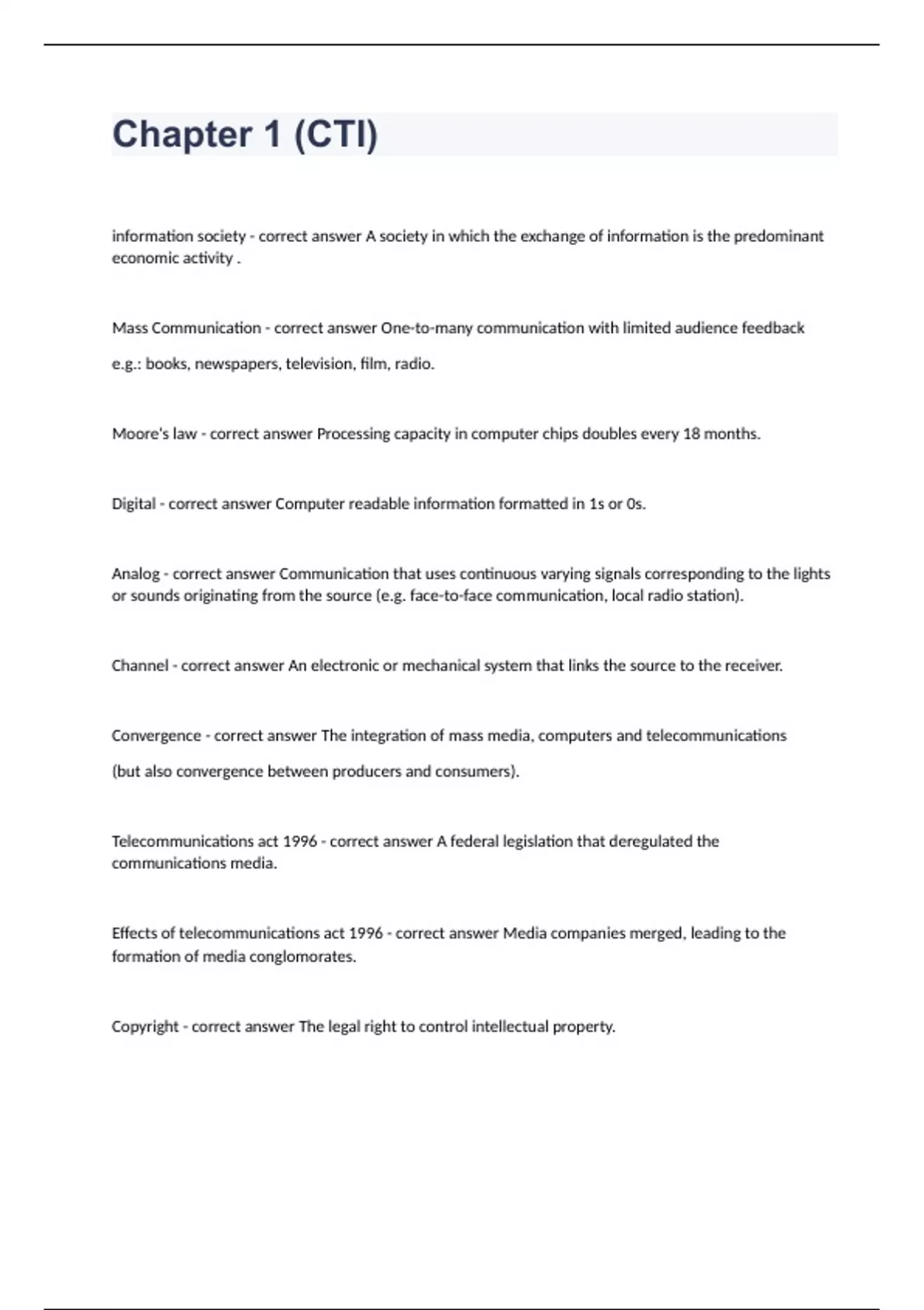 Chapter 1 (CTI)information society - correct answer A society in which the exchange of information is the predominant economic activity . Mass Communication - correct answer One-to-many communication with limited audience feedback e.g.: books, newspapers, television, film, radio. Moore's law - correct answer Processing capacity in computer chips doubles every 18 months. Digital - correct answer Computer readable information formatted in 1s or 0s. Analog - correct answer Communication that uses continuous varying signals corresponding to the lights or sounds originating from the source (e.g. face-to-face communication, local radio station). Channel - correct answer An electronic or mechanical system that links the source to the receiver. Convergence - correct answer The integration of mass media, computers and telecommunications (but also convergence between producers and consumers). Telecommunications act 1996 - correct answer A federal legislation that deregulated the communications media. Effects of telecommunications act 1996 - correct answer Media companies merged, leading to the formation of media conglomorates. Copyright - correct answer The legal right to control intellectual property. Net neutrality - correct answer Notion that users are not discriminated against based on the amount or nature of the data they transfer on the Internet. Digital Divide - correct answer The gap in Internet usage between rich and poor, young and old. Media: pre-agricultural - correct answer Transmitting of ideas to future generations through songs + spoken word. Oral tradition: brought us fairy tales, Odyssey etc. Media: agricultural society - correct answer Development of writing (± 3100 BC, Iraq). Literacy was uncommon. Reproduction of printed works took a lot of time. Media: industrial society - correct answer Invention of printing press (1455). Printed works could be copied relatively cheap and fast. Pre-agricultural: Oral tradition - correct answer Spoken word that brought us fairy tales, Odyssey etc. Effects of the printing press up till 17th century - correct answer - Printing Bible in native language in large numbers - The protestant reformation - Helped create demand for printed news - emergence of newspapers (1690 aprox.) Information society - correct answer large part of population is employed as information worker with their dominant tool as a computer. Information worker - correct answer People who create, process, transform, store information (±1960). Interactive Communication - correct answer Communication that uses feedback to modify a message as it is presented. SMCR Model - correct answer Conventional model of human communication, source-message-channel-receiver-model, for mass communication describes how information goes from the sources through channels and receivers and to feedback at the source. Source - correct answer Originator of the communication. Messsage - correct answer The content of communication, the information that is being exchanged. Encoder - correct answer Translates the message into a form that can be communicated. Channel - correct answer The medium or transmission system used to convey the message from one place to another Decoder - correct answer Reverses the encoding process. Receiver - correct answer Destination of communication. Feedback Mechanism - correct answer Regulates the flow of communication. Noise - correct answer Any distortion or errors that may be introduced during the information exchange Gatekeepers - correct answer People who decide what will appear in the media. Social Media - correct answer Media whose content is created and distributed through social interaction. Social media challenges the linear model because - correct answer Instant feedback, continuous interaction, creators as well as audience, source often amateurs instead of media professionals and many-to-many communication. Communication - correct answer The exchange of meaning.