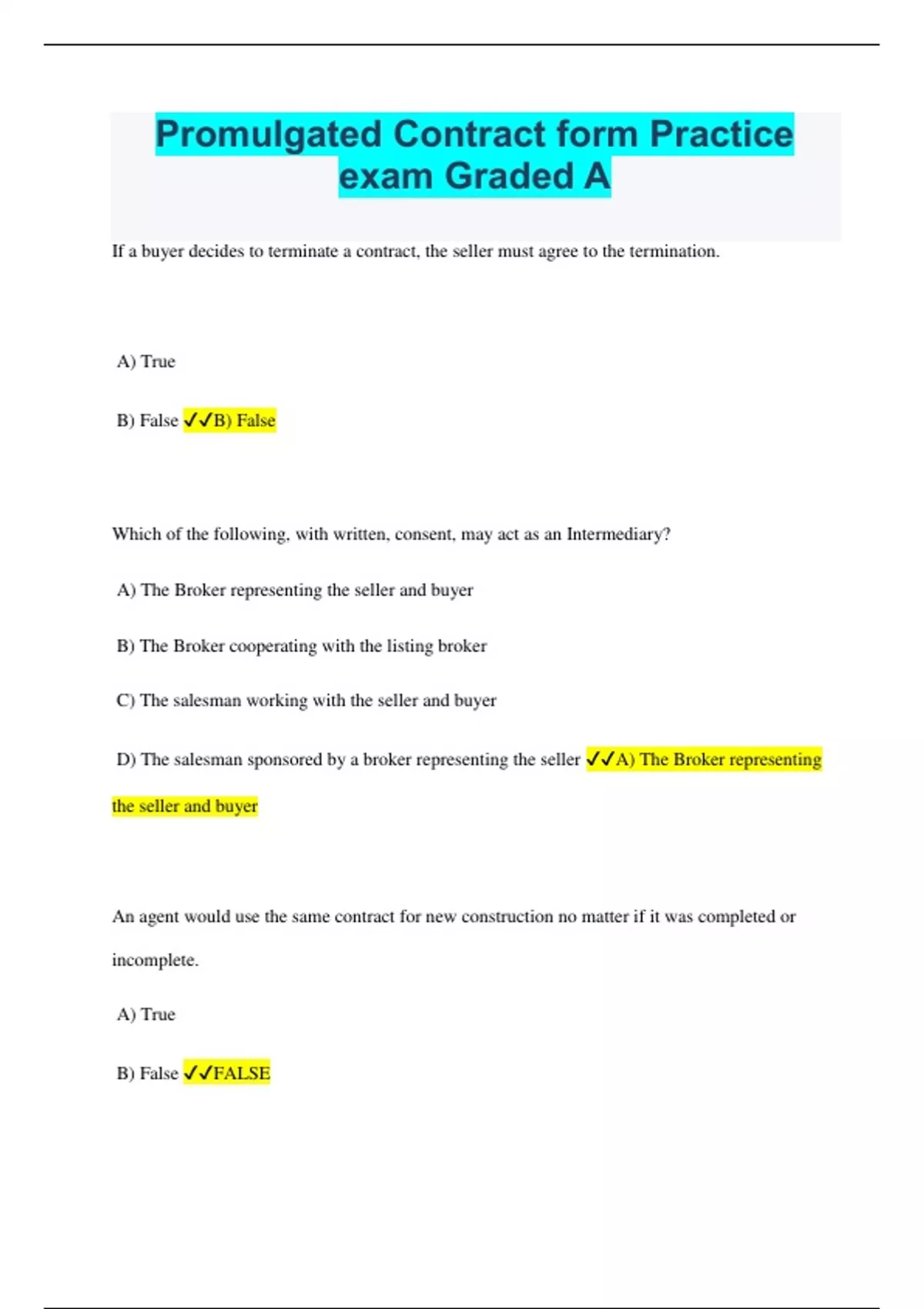 Promulgated Contract form Practice exam Graded A If a buyer decides to terminate a contract, the seller must agree to the termination. A) True B) False B) False Which of the following, with written, consent, may act as an Intermediary? A) The Broker representing the seller and buyer B) The Broker cooperating with the listing broker C) The salesman working with the seller and buyer D) The salesman sponsored by a broker representing the seller A) The Broker representing the seller and buyer An agent would use the same contract for new construction no matter if it was completed or incomplete. A) True B) False FALSE Regarding mediation - the Buyer and Seller are obligated under the terms of the Residential contract to abide by the ruling of the mediator. A) True B) False B) False A bilateral contract is: A) A promise in exchange for a promise B) A promise made only by the agent C) A promise made only by the seller D) No promise A) A promise in exchange for a promise The option paragraph of the contract creates an executed contract. A) True B) False B) False A unilateral contract only binds one party to perform. A) True B) False A) True It is required by law that a seller disclosure any information they have regarding their property. They may use any form or notice that they wish. A) True B) False A) True The Non-Realty Items addendum form for transfer of personal property can include the following EXCEPT A) An agreed dollar amount between buyer and seller for the conveyance B) A place to list the personal property to be conveyed C) A representation by Seller that the items are owned free and clear of encumbrances D) A warranty and guarantee from the seller that the items are in working condition D) A warranty and guarantee from the seller that the items are in working condition The Buyer/Tenant Representation Agreement must always be signed by the agent's sponsoring broker. A) True B) False B) False A survey is required on all Condominium Contracts. A) True B) False