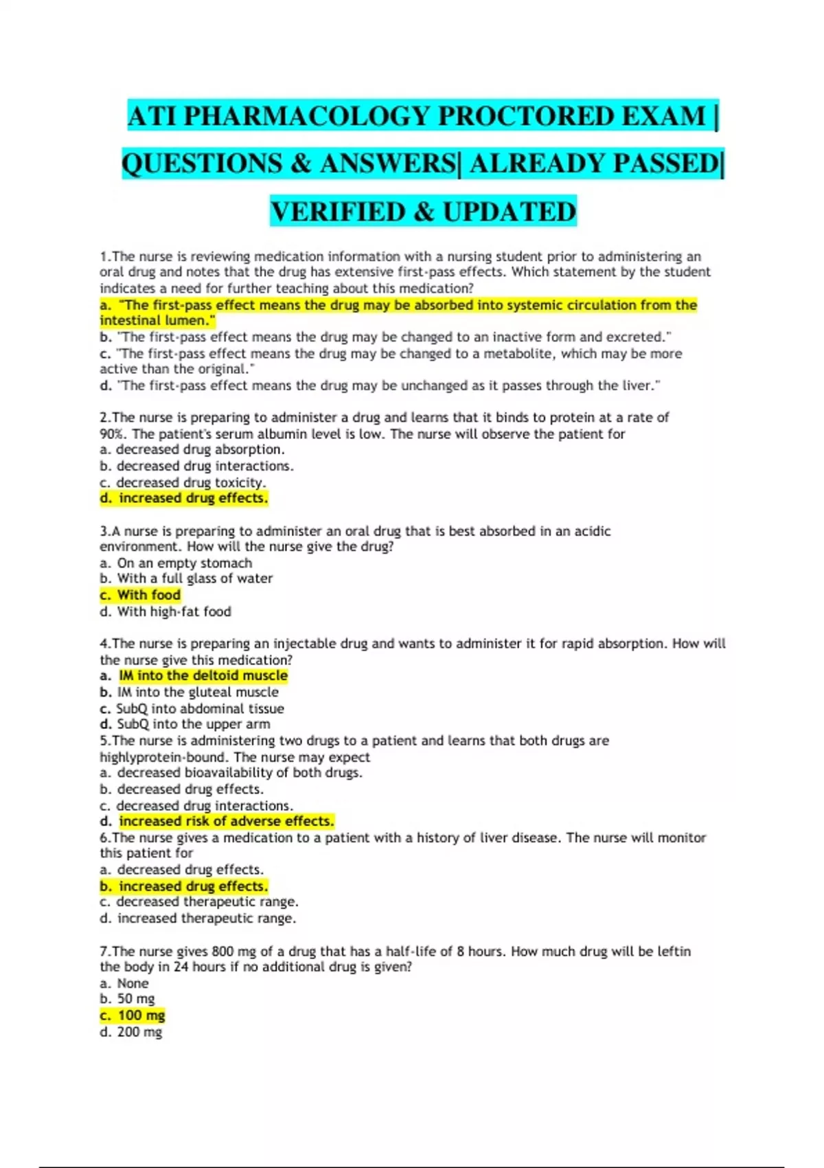 ATI PHARMACOLOGY PROCTORED EXAM | QUESTIONS & ANSWERS| ALREADY PASSED| VERIFIED & UPDATED 1.The nurse is reviewing medication information with a nursing student prior to administering an oral drug and notes that the drug has extensive first-pass effects. Which statement by the student indicates a need for further teaching about this medication? a. "The first-pass effect means the drug may be absorbed into systemic circulation from the intestinal lumen." b. "The first-pass effect means the drug may be changed to an inactive form and excreted." c. "The first-pass effect means the drug may be changed to a metabolite, which may be more active than the original." d. "The first-pass effect means the drug may be unchanged as it passes through the liver." 2.The nurse is preparing to administer a drug and learns that it binds to protein at a rate of 90%. The patient's serum albumin level is low. The nurse will observe the patient for a. decreased drug absorption. b. decreased drug interactions. c. decreased drug toxicity. d. increased drug effects. 3.A nurse is preparing to administer an oral drug that is best absorbed in an acidic environment. How will the nurse give the drug? a. On an empty stomach b. With a full glass of water c. With food d. With high-fat food