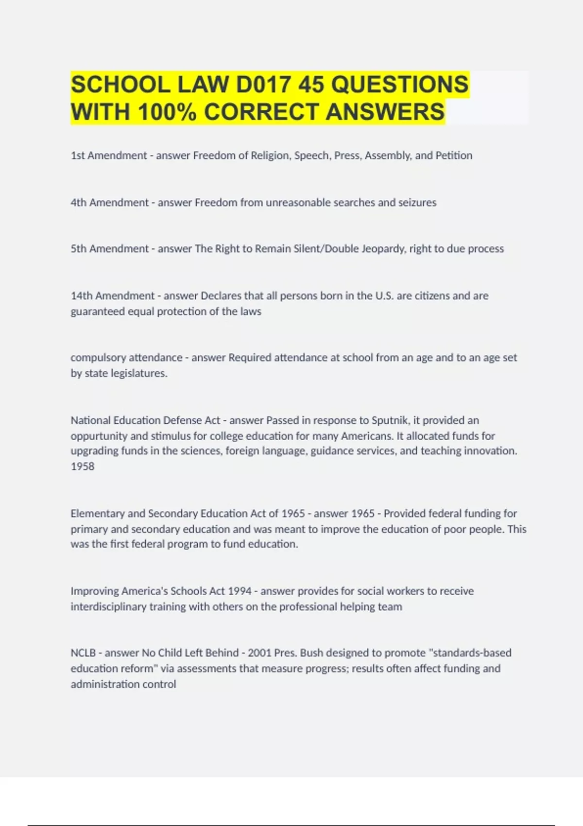 SCHOOL LAW D017| 45 QUESTIONS WITH 100% CORRECT ANSWERS