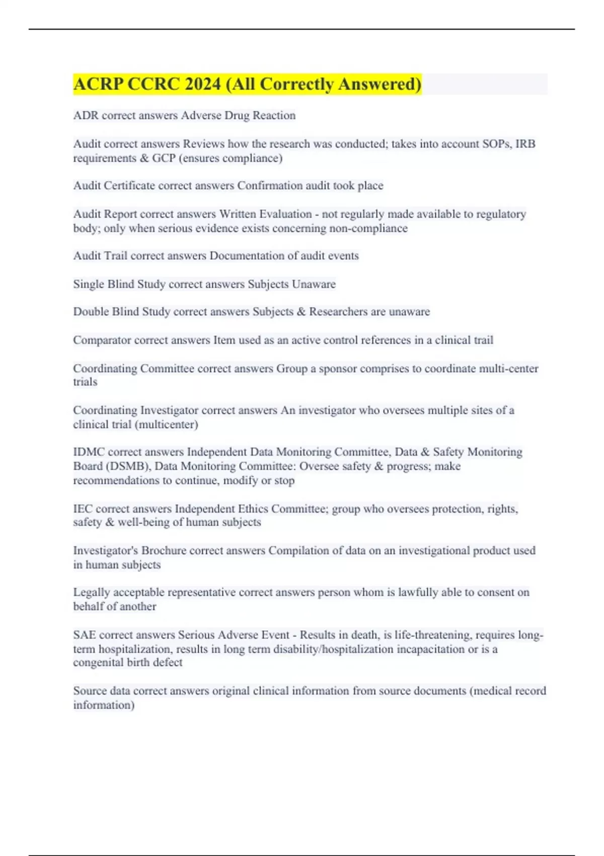 ADR correct answers Adverse Drug Reaction Audit correct answers Reviews how the research was conducted; takes into account SOPs, IRB requirements & GCP (ensures compliance) Audit Certificate correct answers Confirmation audit took place Audit Report correct answers Written Evaluation - not regularly made available to regulatory body; only when serious evidence exists concerning non-compliance Audit Trail correct answers Documentation of audit events Single Blind Study correct answers Subjects Unaware Double Blind Study correct answers Subjects & Researchers are unaware Comparator correct answers Item used as an active control references in a clinical trail Coordinating Committee correct answers Group a sponsor comprises to coordinate multi-center trials Coordinating Investigator correct answers An investigator who oversees multiple sites of a clinical trial (multicenter) IDMC correct answers Independent Data Monitoring Committee, Data & Safety Monitoring Board (DSMB), Data Monitoring Committee: Oversee safety & progress; make recommendations to continue, modify or stop IEC correct answers Independent Ethics Committee; group who oversees protection, rights, safety & well-being of human subjects Investigator's Brochure correct answers Compilation of data on an investigational product used in human subjects Legally acceptable representative correct answers person whom is lawfully able to consent on behalf of another SAE correct answers Serious Adverse Event - Results in death, is life-threatening, requires long-term hospitalization, results in long term disability/hospitalization incapacitation or is a congenital birth defect Source data correct answers original clinical information from source documents (medical record information)