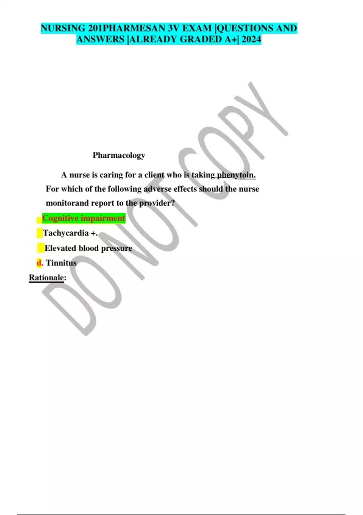 NURSING 201PHARMESAN 3V EXAM |QUESTIONS AND ANSWERS |ALREADY GRADED A+| 2024 Pharmacology A nurse is caring for a client who is taking phenytoin. For which of the following adverse effects should the nurse monitorand report to the provider? Cognitive impairment Tachycardia +. Elevated blood pressure d. Tinnitus Rationale: