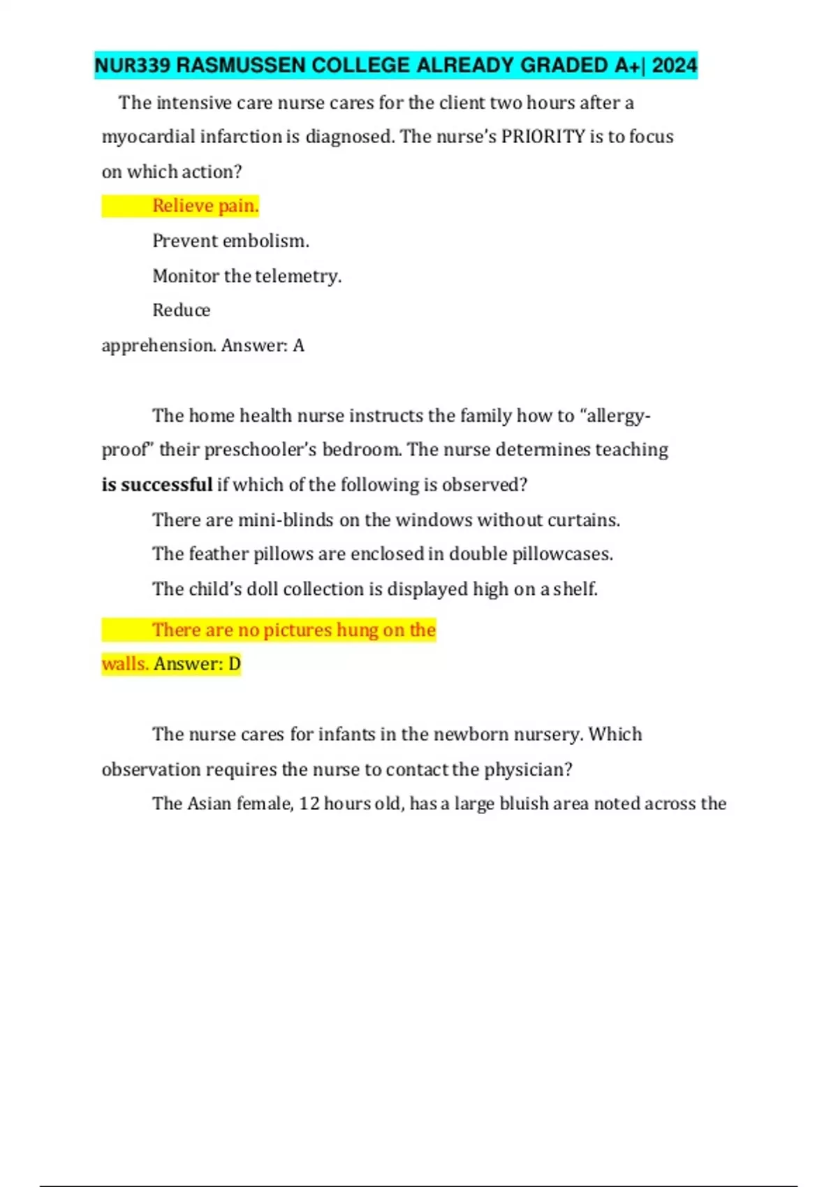 NUR339 RASMUSSEN COLLEGE ALREADY GRADED A+| 2024 The intensive care nurse cares for the client two hours after a myocardial infarction is diagnosed. The nurse’s PRIORITY is to focus on which action? Relieve pain. Prevent embolism. Monitor the telemetry. Reduce apprehension. Answer: A The home health nurse instructs the family how to “allergyproof” their preschooler’s bedroom. The nurse determines teaching is successful if which of the following is observed? There are mini-blinds on the windows without curtains. The feather pillows are enclosed in double pillowcases. The child’s doll collection is displayed high on a shelf. There are no pictures hung on the walls. Answer: