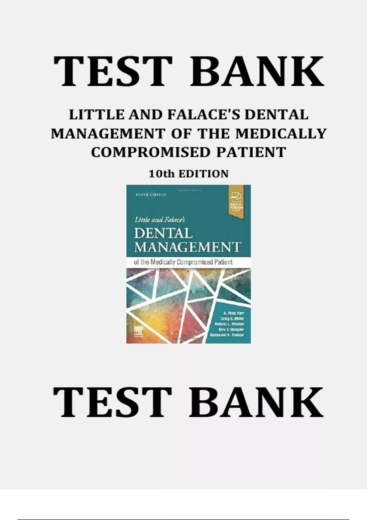 LITTLE AND FALACE'S DENTAL MANAGEMENT OF THE MEDICALLY COMPROMISED PATIENT 10TH EDITION TEST BANK ISBN-978-0323809450 Latest Verified Review 2023 Practice Questions and Answers for Exam Preparation, 100% Correct with Explanations, Highly Recommended, Download to Score A+ Little: Dental Management of the Medically Compromised Patient, 10th Edition Test Bank Table of Contents PART ONE: PATIENT EVALUATION AND RISK ASSESSMENT Chapter 1: Patient Evaluation and Risk Assessment PART TWO: CARDIOVASCULAR DISEASE Chapter 2: Infective Endocarditis Chapter 3: Hypertension Chapter 4: Ischemic Heart Disease Chapter 5: Cardiac Arrhythmias Chapter 6: Heart Failure (or Congestive Heart Failure) PART THREE: PULMONARY DISEASE Chapter 7: Pulmonary Disease Chapter 8: Smoking and Tobacco Use Cessation Chapter 9: Sleep-Related Breathing Disorders PART FOUR: GASTROINTESTIAL DISEASE Chapter 10: Liver Disease Chapter 11: Gastrointestinal Disease PART FIVE: GENITOURINARY DISEASE Chapter 12: Chronic Kidney Disease and Dialysis Chapter 13: Sexually Transmitted Diseases PART SIX: ENDOCRINE AND METABOLIC DISEASE Chapter 14: Diabetes Mellitus Chapter 15: Adrenal Insufficiency Chapter 16: Thyroid Diseases Chapter 17: Pregnancy and Breast Feeding PART SEVEN: IMMUNOLOGIC DISEASE Chapter 18: AIDS, HIV Infection, and Related Conditions Chapter 19: Allergy Chapter 20: Rheumatologic and Connective Tissue Disorders Chapter 21: Organ and Bone Marrow Transplantation PART EIGHT: HEMATOLOGIC AND ONCOLOGIC DISEASE Chapter 22: Disorders of Red Blood Cells Chapter 23: Disorders of White Blood Cells Chapter 24: Acquired Bleeding and Hypercoagulable Disorders Chapter 25: Congenital Bleeding and Hypercoagulable Disorders Chapter 26: Cancer and Oral Care of the Patient PART NINE: NEUROLOGIC, BEHAVIORAL, AND PSYCHIATRIC DISORDERS Chapter 27: Neurologic Disorders Chapter 28: Anxiety, Eating Disorders, and Behavioral Reactions to Illness Chapter 29: Psychiatric Disorders Chapter 30: Drug and Alcohol Abuse