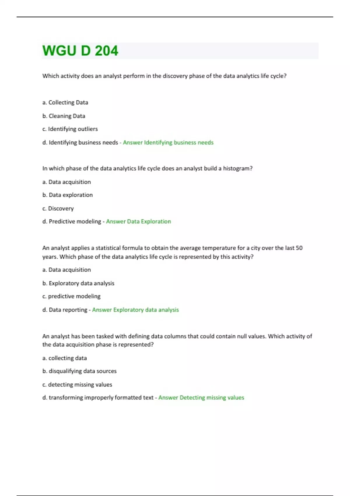 Which activity does an analyst perform in the discovery phase of the data analytics life cycle? a. Collecting Data b. Cleaning Data c. Identifying outliers d. Identifying business needs - Answer Identifying business needs In which phase of the data analytics life cycle does an analyst build a histogram? a. Data acquisition b. Data exploration c. Discovery d. Predictive modeling - Answer Data Exploration An analyst applies a statistical formula to obtain the average temperature for a city over the last 50 years. Which phase of the data analytics life cycle is represented by this activity? a. Data acquisition b. Exploratory data analysis c. predictive modeling d. Data reporting - Answer Exploratory data analysis An analyst has been tasked with defining data columns that could contain null values. Which activity of the data acquisition phase is represented? a. collecting data b. disqualifying data sources c. detecting missing values d. transforming improperly formatted text - Answer Detecting missing valuesWhich activity in the data analytics life cycle occurs during the data acquisition phase and requires the most time and effort from the data analyst? a. selecting the data sources b. importing data into a database c. cleaning data defining goals - Answer Cleaning Data What might be developed by data analysts when acquiring data from a data warehouse? a.The procedures for extracting files from the data warehouse b. The procedures for updating tables in the data warehouse c. The relational structure of tables d. The SQL queries of data within the tables - Answer The SQL queries of data within the tables What can be identified using a box plot? a. frequency b. correlation c. interquartile range d. mean - Answer Interquartile range What will be a consequence of poor attention to detail during the data exploration phase? a. Not enough variables will be considered in the analysis. b. The outcome of the analysis will be misaligned to business needs. c. The analyst will lack insight into the structure of the data set. d. The model will be built using the wrong data set. - Answer The analyst will lack insight into the structure of the data set. Which aspect of data exploration occurs when an analyst writes code to compile a bar graph of dog food sales per month? a. Performance of a correlation analysis b. Analysis of data anomaliesc. Verification through visualization d. Determination of variabilities - Answer Verification through visualization