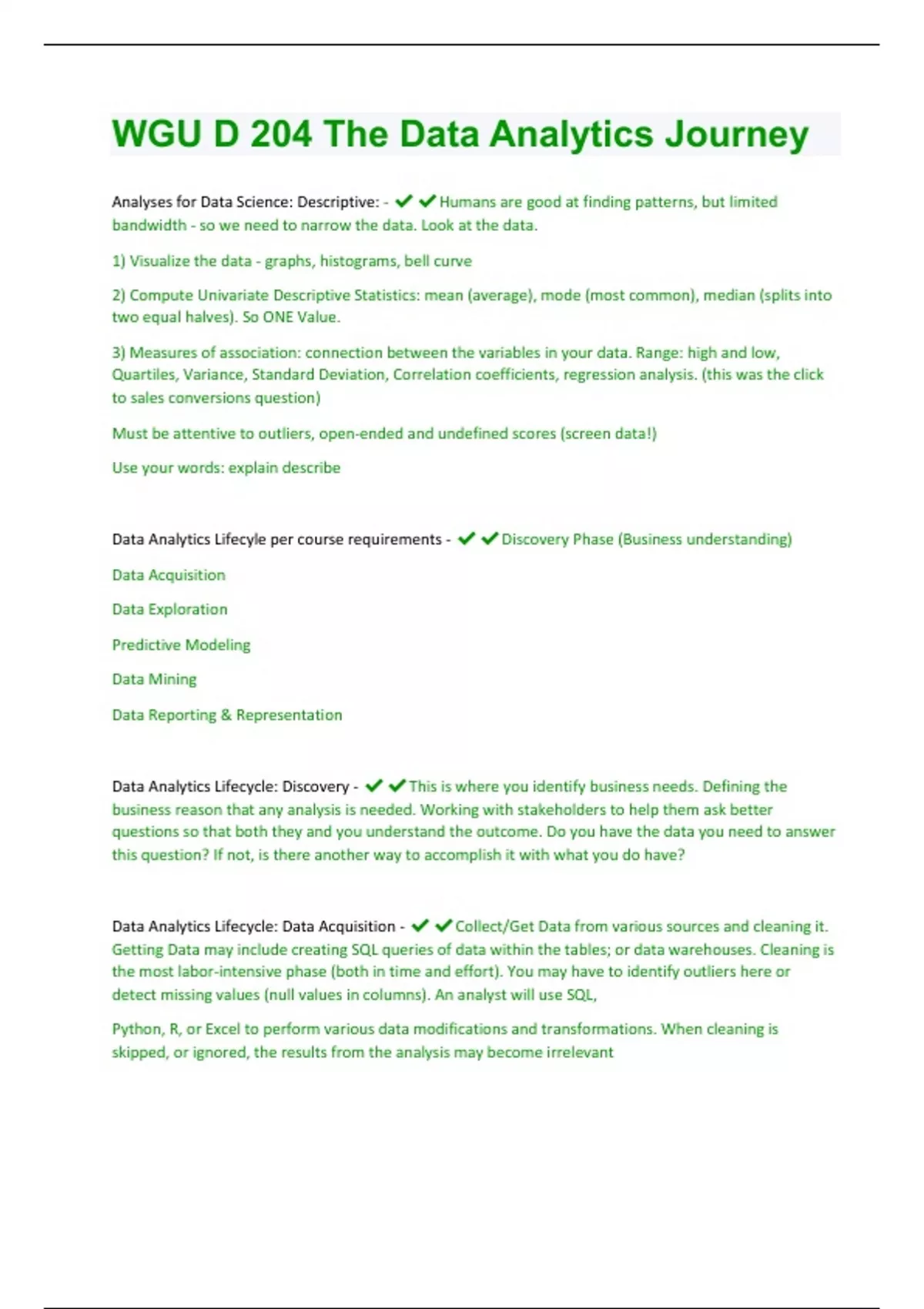 Analyses for Data Science: Descriptive: - Humans are good at finding patterns, but limited bandwidth - so we need to narrow the data. Look at the data. 1) Visualize the data - graphs, histograms, bell curve 2) Compute Univariate Descriptive Statistics: mean (average), mode (most common), median (splits into two equal halves). So ONE Value. 3) Measures of association: connection between the variables in your data. Range: high and low, Quartiles, Variance, Standard Deviation, Correlation coefficients, regression analysis. (this was the click to sales conversions question) Must be attentive to outliers, open-ended and undefined scores (screen data!) Use your words: explain describe Data Analytics Lifecyle per course requirements - Discovery Phase (Business understanding) Data Acquisition Data Exploration Predictive Modeling Data Mining Data Reporting & Representation Data Analytics Lifecycle: Discovery - This is where you identify business needs. Defining the business reason that any analysis is needed. Working with stakeholders to help them ask better questions so that both they and you understand the outcome. Do you have the data you need to answer this question? If not, is there another way to accomplish it with what you do have? Data Analytics Lifecycle: Data Acquisition - Collect/Get Data from various sources and cleaning it. Getting Data may include creating SQL queries of data within the tables; or data warehouses. Cleaning is the most labor-intensive phase (both in time and effort). You may have to identify outliers here or detect missing values (null values in columns). An analyst will use SQL, Python, R, or Excel to perform various data modifications and transformations. When cleaning is skipped, or ignored, the results from the analysis may become irrelevantData Analytics Lifecycle: Data Exploration - Now that the data is cleaned, you can begin to familiarize yourself with it. You are beginning to understand the basic nature of data and the relationships. Making histograms and generally understanding what is included. Creating bar graphs will give you verification through visualization. This may include applying a statistical formula to obtain the avg. temp of a city over the last 50 years. Poor attention to detail in this phase will give you a lack of insight into the structure of the data set. Data Analytics Lifecycle: Predictive Modeling - Is where you are taking those insights and operationalizing them to predict future outcomes (oil company uses robots to detect corrosion over time - reducing shutdown/interruptions). You go beyond describing to actual modeling. Churn Analysis could be performed (evaluation of a company's customer loss repeat in order to reduce it (analyses your product and how people use it). Common mistake is to develop a model before the research question is known. Again, Python and R play key roles here. Data Analytics Lifecycle: Data Mining - Find patterns and insights. Find correlations and test hypothesis. Example: data analyst has identified combinations of sales transactions that frequently occur together in data over the past 5 years. It is possible in this phase to reduce significantly the data which results in a sample size that is too small. Some call this machine learning. Python and R also play key roles here. Data Analytics Lifecycle: Data Reporting & Representation - Analysts creates a story to report on data findings. Provide actionable insights that can inform decision makers; provide conclusion from the analysis in engaging manner. Effective data reporting is to exclude unrelated data. Here you may use Tableau or PowerBi. Data Science Pathway (per video) - Planning Wrangling Modeling Applying the Model Data Science Pathway: Planning: - 1.- Define Goals: what do you want to accomplish? 2.- Organize Resources: right computers, people. 3.- Coordinate People: team effort. 4.- Schedule Project: timeboxing - Gantt ChartData Science Pathway: Wrangling - 5.- Get Data: internal, external, APIs. Raw materials. 6.- Clean Data (enormous Task): ready to fit the application you are using 7.- Explore Data: visualizations, numerical summaries. 8.- Refine data: based on #7 - may need to recategorize cases, combine variables into new scores. Data Science Pathway: Modeling - 9.- Create Model: statistical models, linear regressions, decision trees, neural networks. 10.- Validate Model: how well this will generalize the data set; when left out conclusions fall apart. 11.- Evaluate the Model: how well does it fit the data, what is the ROI? How usable is it? 12.- Refine the Model: adjusting processes. Data Science Pathway: Applying - 13.- Present the Model: show to investors, clients. What you learned 14.- Deploy the model: put online or dashboard to produce recommendations 15.- Revisit the Model. How well is it performing? May have to redo 16.- Archive the assets. Documentation of the project. Analyses for Data Science: Predictive: - Predict the future. 1) Use relevant past data 2) Model the outcome 3) Apply to new data. 4) Validate model with new data (often neglected, but CRITICAL) Predict Illness, payoff debt; recommend products online shopping. One Definition: Future events: use present data to predict into the future. Use prediction to explain alternative events - estimate . Methods: classification (K, Centroid, Clustering methods); Decision Trees, Random Forest; Neural Networks (machine learning that mimics the brain). Regression analysis: gives you an understandable equation to predict a single outcome based on multiple predictor variables. Very flexible, usually linear, easy to interpret.Analyses for Data Science: Trend Analysis - Graph of changes over time - connect the dots to get a road map. Look at change over time. Can be linear, exponential, logarithmic (grows rapidly until it hits a ceiling), sigmoid (logistic function), sinusoidal (cyclical). Change points: changes in the resting state of the data. Decomposition (break the trend over time into s