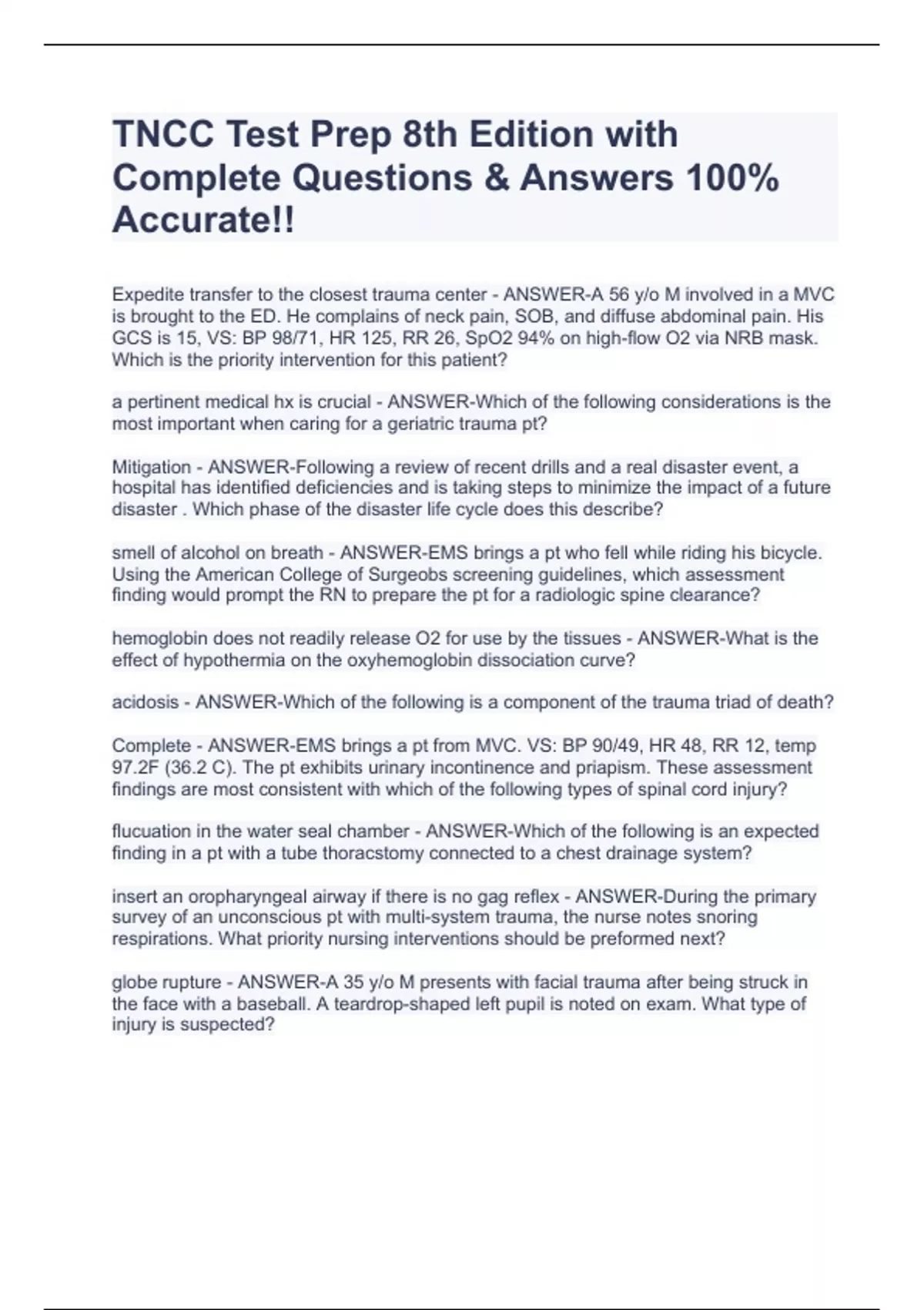 Expedite transfer to the closest trauma center - ANSWER-A 56 y/o M involved in a MVC is brought to the ED. He complains of neck pain, SOB, and diffuse abdominal pain. His GCS is 15, VS: BP 98/71, HR 125, RR 26, SpO2 94% on high-flow O2 via NRB mask. Which is the priority intervention for this patient? a pertinent medical hx is crucial - ANSWER-Which of the following considerations is the most important when caring for a geriatric trauma pt? Mitigation - ANSWER-Following a review of recent drills and a real disaster event, a hospital has identified deficiencies and is taking steps to minimize the impact of a future disaster . Which phase of the disaster life cycle does this describe? smell of alcohol on breath - ANSWER-EMS brings a pt who fell while riding his bicycle. Using the American College of Surgeobs screening guidelines, which assessment finding would prompt the RN to prepare the pt for a radiologic spine clearance? hemoglobin does not readily release O2 for use by the tissues - ANSWER-What is the effect of hypothermia on the oxyhemoglobin dissociation curve? acidosis - ANSWER-Which of the following is a component of the trauma triad of death? Complete - ANSWER-EMS brings a pt from MVC. VS: BP 90/49, HR 48, RR 12, temp 97.2F (36.2 C). The pt exhibits urinary incontinence and priapism. These assessment findings are most consistent with which of the following types of spinal cord injury? flucuation in the water seal chamber - ANSWER-Which of the following is an expected finding in a pt with a tube thoracstomy connected to a chest drainage system? insert an oropharyngeal airway if there is no gag reflex - ANSWER-During the primary survey of an unconscious pt with multi-system trauma, the nurse notes snoring respirations. What priority nursing interventions should be preformed next? globe rupture - ANSWER-A 35 y/o M presents with facial trauma after being struck in the face with a baseball. A teardrop-shaped left pupil is noted on exam. What type of injury is suspected?