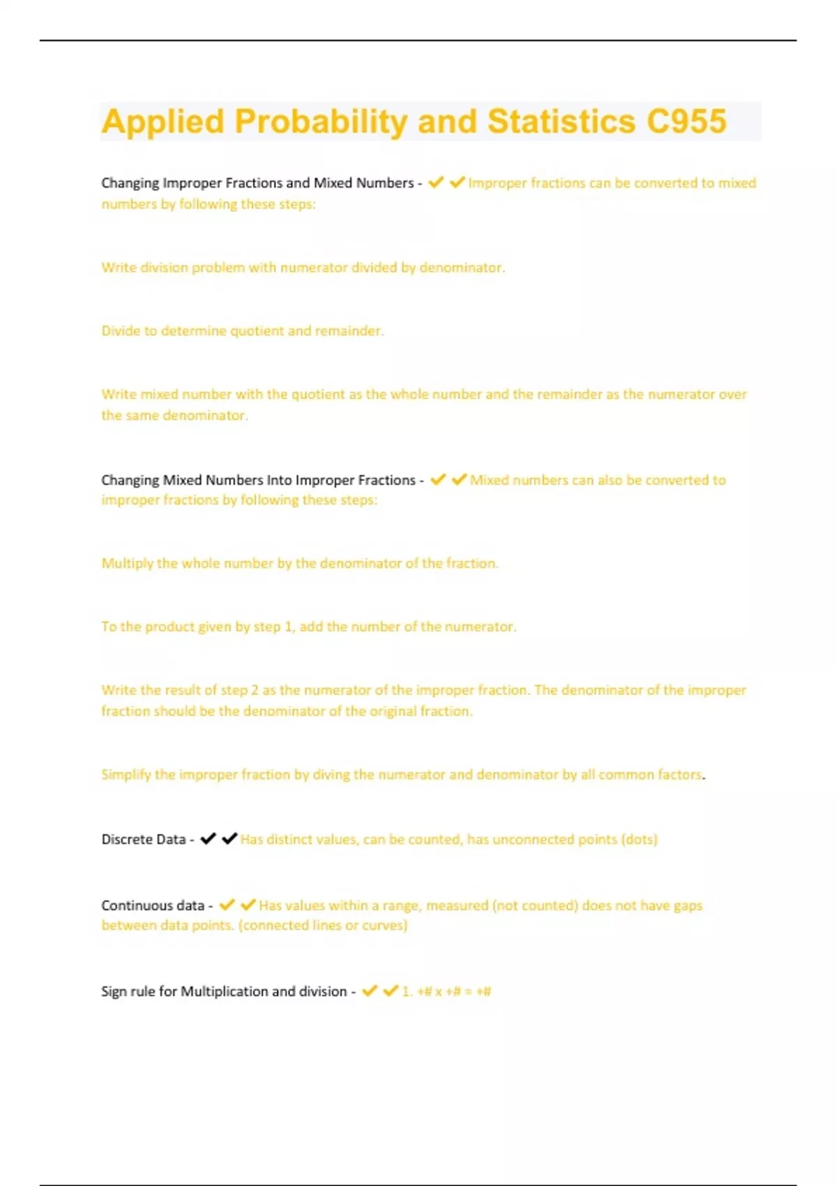 Changing Improper Fractions and Mixed Numbers - Improper fractions can be converted to mixed numbers by following these steps: Write division problem with numerator divided by denominator. Divide to determine quotient and remainder. Write mixed number with the quotient as the whole number and the remainder as the numerator over the same denominator. Changing Mixed Numbers Into Improper Fractions - Mixed numbers can also be converted to improper fractions by following these steps: Multiply the whole number by the denominator of the fraction. To the product given by step 1, add the number of the numerator. Write the result of step 2 as the numerator of the improper fraction. The denominator of the improper fraction should be the denominator of the original fraction. Simplify the improper fraction by diving the numerator and denominator by all common factors. Discrete Data - Has distinct values, can be counted, has unconnected points (dots) Continuous data - Has values within a range, measured (not counted) does not have gaps between data points. (connected lines or curves) Sign rule for Multiplication and division - 1. +# x +# = +#2. -# x -# = +# A product or division of two numbers of the same sign will result in a positive number 3. -# x +# = -# 4. +# x -# = -# A product or division of two numbers of different signs will result in a negative number Prime Number - A prime number is a number that has exactly two positive factors; 1 and itself. Composite Number - A number that is not prime. It has 2 or more positive factor, including 1 and itself. Prime Factorization - Writing the number as a product of only prime numbers