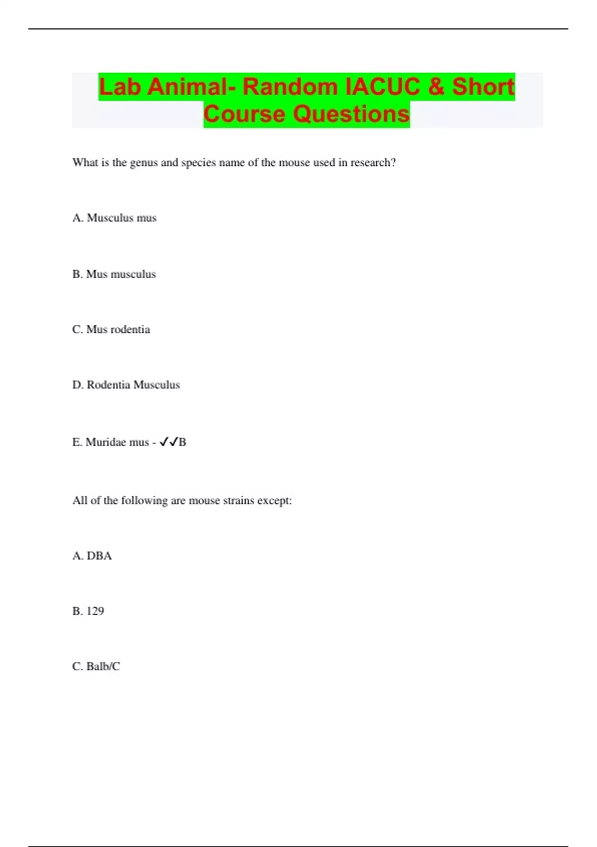 Lab Animal- Random IACUC & Short Course | Questions with 100% Correct Answers | Latest Update 2024 | Verified