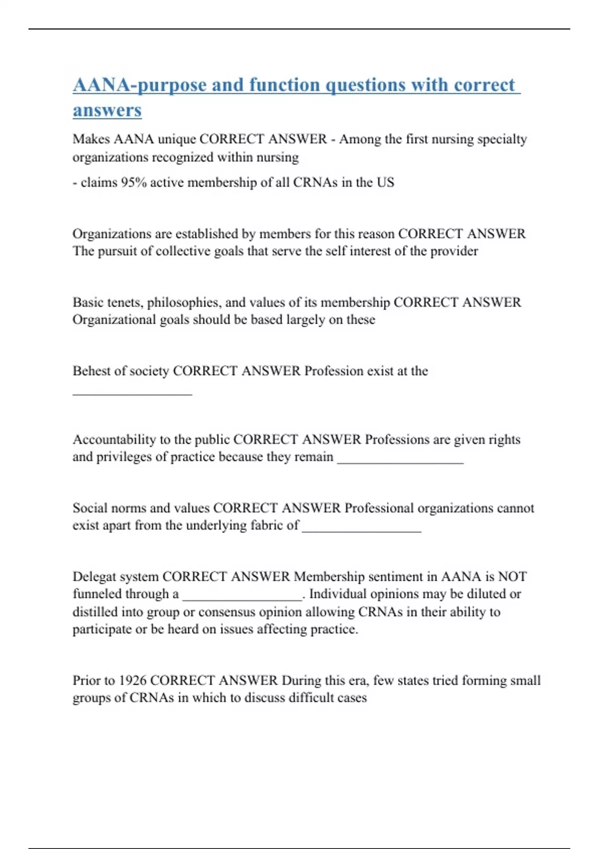 Makes AANA unique CORRECT ANSWER - Among the first nursing specialty organizations recognized within nursing - claims 95% active membership of all CRNAs in the US Organizations are established by members for this reason CORRECT ANSWER The pursuit of collective goals that serve the self interest of the provider Basic tenets, philosophies, and values of its membership CORRECT ANSWER Organizational goals should be based largely on these Behest of society CORRECT ANSWER Profession exist at the _________________ Accountability to the public CORRECT ANSWER Professions are given rights and privileges of practice because they remain __________________ Social norms and values CORRECT ANSWER Professional organizations cannot exist apart from the underlying fabric of _________________ Delegat system CORRECT ANSWER Membership sentiment in AANA is NOT funneled through a _________________. Individual opinions may be diluted or distilled into group or consensus opinion allowing CRNAs in their ability to participate or be heard on issues affecting practice. Prior to 1926 CORRECT ANSWER During this era, few states tried forming small groups of CRNAs in which to discuss dif
