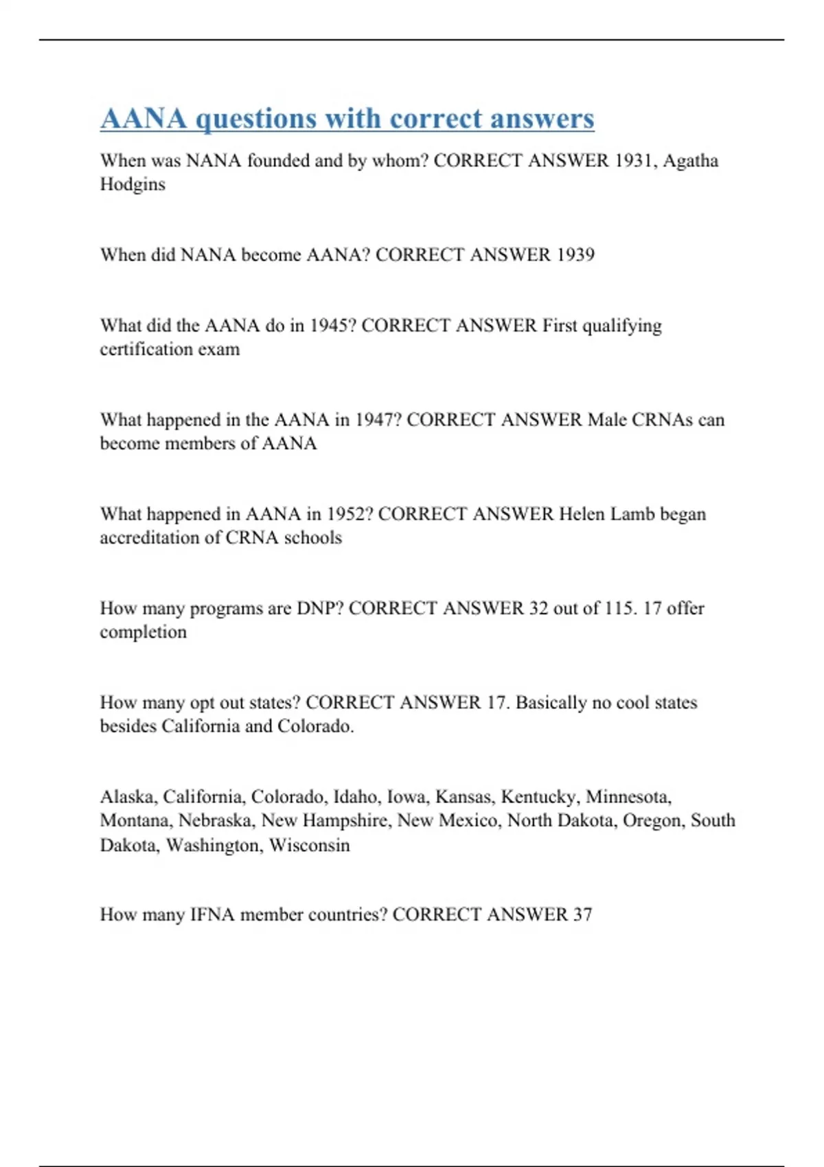 When was NANA founded and by whom? CORRECT ANSWER 1931, Agatha Hodgins When did NANA become AANA? CORRECT ANSWER 1939 What did the AANA do in 1945? CORRECT ANSWER First qualifying certification exam What happened in the AANA in 1947? CORRECT ANSWER Male CRNAs can become members of AANA What happened in AANA in 1952? CORRECT ANSWER Helen Lamb began accreditation of CRNA schools How many programs are DNP? CORRECT ANSWER 32 out of 115. 17 offer completion How many opt out states? CORRECT ANSWER 17. Basically no cool states besides California and Colorado.
