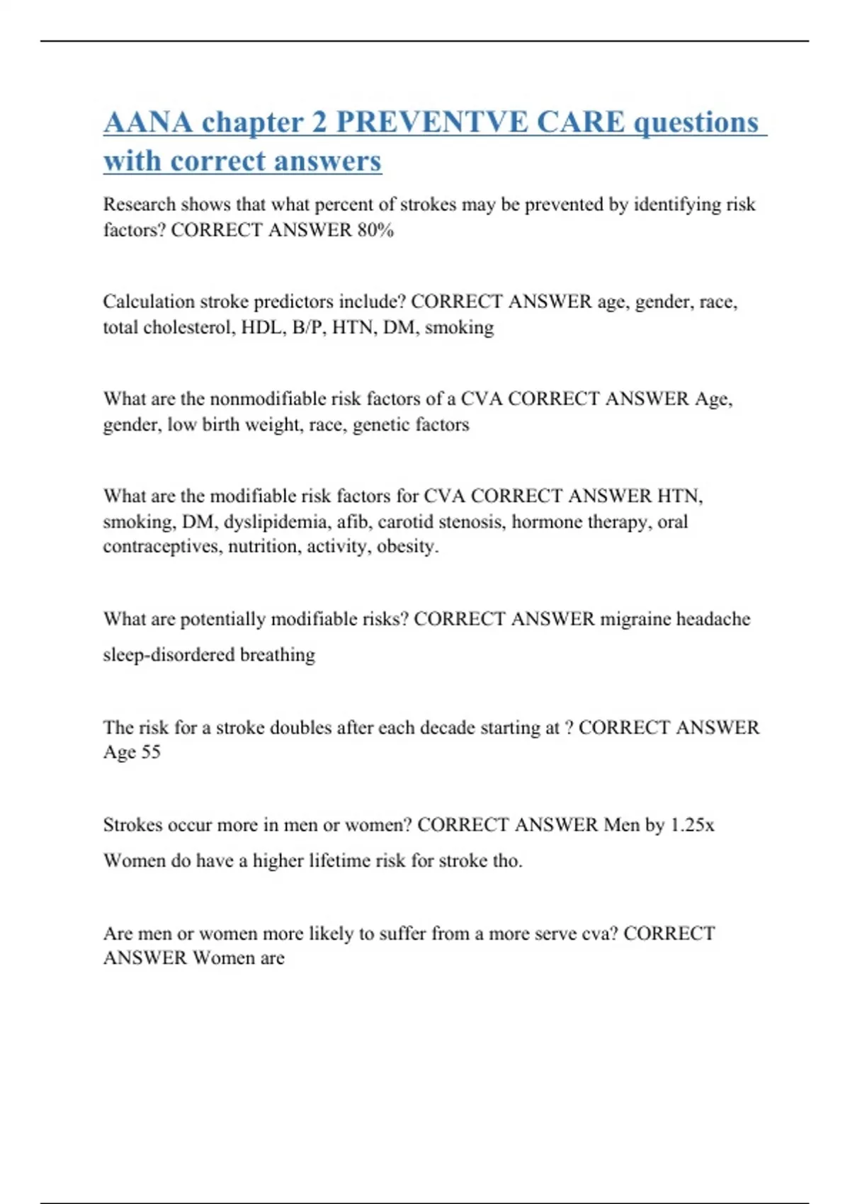 Research shows that what percent of strokes may be prevented by identifying risk factors? CORRECT ANSWER 80% Calculation stroke predictors include? CORRECT ANSWER age, gender, race, total cholesterol, HDL, B/P, HTN, DM, smoking What are the nonmodifiable risk factors of a CVA CORRECT ANSWER Age, gender, low birth weight, race, genetic factors What are the modifiable risk factors for CVA CORRECT ANSWER HTN, smoking, DM, dyslipidemia, afib, carotid stenosis, hormone therapy, oral contraceptives, nutrition, activity, obesity. What are potentially modifiable risks? CORRECT ANSWER migraine headache sleep-disordered breathing The risk for a stroke doubles after each decade starting at ? CORRECT ANSWER Age 55 Strokes occur more in men or women? CORRECT ANSWER Men by 1.25x Women do have a higher lifetime risk for stroke tho. Are men or women more likely to suffer from a more serve cva? CORRECT ANSWER Women are