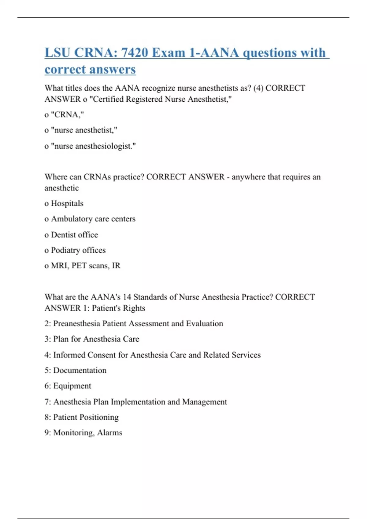 LSU CRNA: 7420 Exam 1-AANA questions with correct answers
