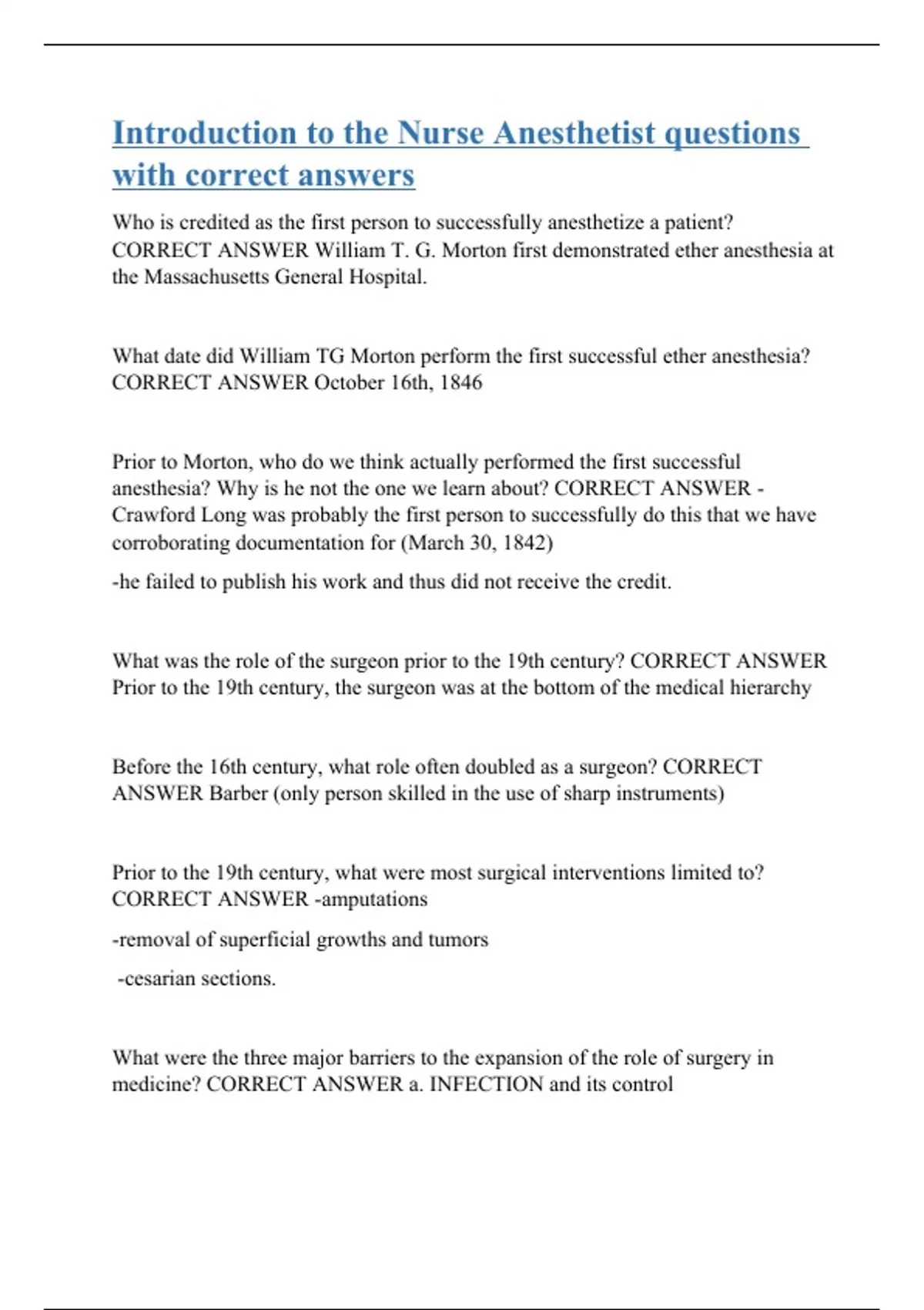Who is credited as the first person to successfully anesthetize a patient? CORRECT ANSWER William T. G. Morton first demonstrated ether anesthesia at the Massachusetts General Hospital. What date did William TG Morton perform the first successful ether anesthesia? CORRECT ANSWER October 16th, 1846 Prior to Morton, who do we think actually performed the first successful anesthesia? Why is he not the one we learn about? CORRECT ANSWER -Crawford Long was probably the first person to successfully do this that we have corroborating documentation for (March 30, 1842) -he failed to publish his work and thus did not receive the credit. What was the role of the surgeon prior to the 19th century? CORRECT ANSWER Prior to the 19th century, the surgeon was at the bottom of the medical hierarchy Before the 16th century, what role often doubled as a surgeon? CORRECT ANSWER Barber (only person skilled in the use of sharp instruments) Prior to the 19th century, what were most surgical interventions limited to? CORRECT ANSWER -amputations -removal of superficial growths and tum