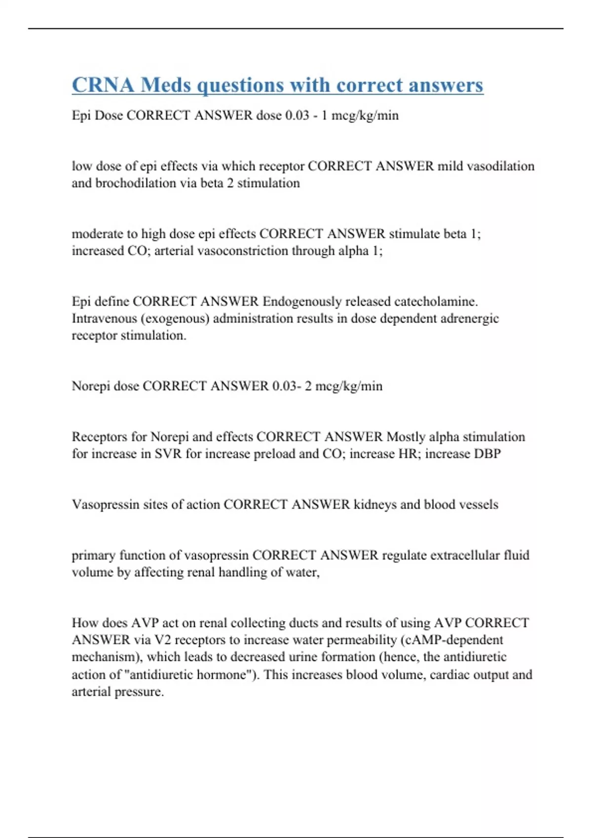 Epi Dose CORRECT ANSWER dose 0.03 - 1 mcg/kg/min low dose of epi effects via which receptor CORRECT ANSWER mild vasodilation and brochodilation via beta 2 stimulation moderate to high dose epi effects CORRECT ANSWER stimulate beta 1; increased CO; arterial vasoconstriction through alpha 1; Epi define CORRECT ANSWER Endogenously released catecholamine. Intravenous (exogenous) administration results in dose dependent adrenergic receptor stimulation. Norepi dose CORRECT ANSWER 0.03- 2 mcg/kg/min Receptors for Norepi and effects CORRECT ANSWER Mostly alpha stimulation for increase in SVR for increase preload and CO; increase HR; increase DBP Vasopressin sites of action CORRECT ANSWER kidneys and blood vessels primary function of vasopressin CORRECT ANSWER regulate extracellular fluid volume by affecting renal handling of water, How does AVP act on renal collecting ducts and results of using AVP CORRECT ANSWER via V2 receptors to increase water permeability (cAMP-dependent mechanism), which leads to decreased urine formation (hence, the antidiuretic action of "antidiuretic hormone"). This increases blood volume, cardiac output and arterial pressure.