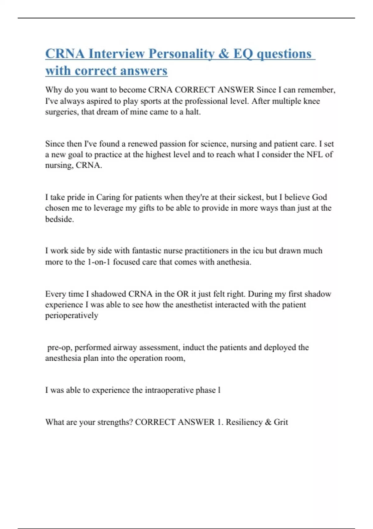 Why do you want to become CRNA CORRECT ANSWER Since I can remember, I've always aspired to play sports at the professional level. After multiple knee surgeries, that dream of mine came to a halt. Since then I've found a renewed passion for science, nursing and patient care. I set a new goal to practice at the highest level and to reach what I consider the NFL of nursing, CRNA. I take pride in Caring for patients when they're at their sickest, but I believe God chosen me to leverage my gifts to be able to provide in more ways than just at the bedside. I work side by side with fantastic nurse practitioners in the icu but drawn much more to the 1-on-1 focused care that comes with anethesia. Every time I shadowed CRNA in the OR it just felt right. During my first shadow experience I was able to see how the anesthetist interacted with the patient perioperatively pre-op, performed airway assessment, induct the patients and deployed the anesthesia plan into the operation room, I was able to experience the intraoperative phase l What are your strengths? CORRE