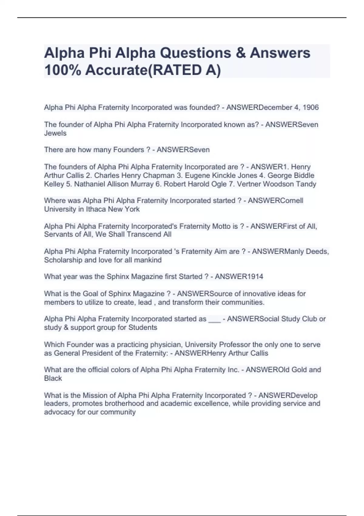 Alpha Phi Alpha Fraternity Incorporated was founded? - ANSWERDecember 4, 1906 The founder of Alpha Phi Alpha Fraternity Incorporated known as? - ANSWERSeven Jewels There are how many Founders ? - ANSWERSeven The founders of Alpha Phi Alpha Fraternity Incorporated are ? - ANSWER1. Henry Arthur Callis 2. Charles Henry Chapman 3. Eugene Kinckle Jones 4. George Biddle Kelley 5. Nathaniel Allison Murray 6. Robert Harold Ogle 7. Vertner Woodson Tandy Where was Alpha Phi Alpha Fraternity Incorporated started ? - ANSWERCornell University in Ithaca New York Alpha Phi Alpha Fraternity Incorporated's Fraternity Motto is ? - ANSWERFirst of All, Servants of All, We Shall Transcend All Alpha Phi Alpha Fraternity Incorporated 's Fraternity Aim are ? - ANSWERManly Deeds, Scholarship and love for all mankind What year was the Sphinx Magazine first Started ? - ANSWER1914 What is the Goal of Sphinx Magazine ? - ANSWERSource of innovative ideas for members to utilize to create, lead , and transform their communities. Alpha Phi Alpha Fraternity Incorporated started as ___ - ANSWERSocial Study Club or study & support group for Students Which Founder was a practicing physician, University Professor the only one to serve as General President of the Fraternity: - ANSWERHenry Arthur Callis What are the official colors of Alpha Phi Alpha Fraternity Inc. - ANSWEROld Gold and Black What is the Mission of Alpha Phi Alpha Fraternity Incorporated ? - ANSWERDevelop leaders, promotes brotherhood and academic excellence, while providing service and advocacy for our community Name four parts of the vision /objectives of Alpha Phi Alpha Fraternity, Inc - ANSWER1) prepare them for the greatest usefulness in the causes of humanity, freedom, and dignity of individuals 2) to aid down-trodden humanity in its effort to achieve higher social, economic and intellectual status 3) to stimulate the ambition of its members 4) to encourage the highest and noblest form of manhood. Name the four stages of growth - ANSWER1) Social Club 2) Organization 3) S