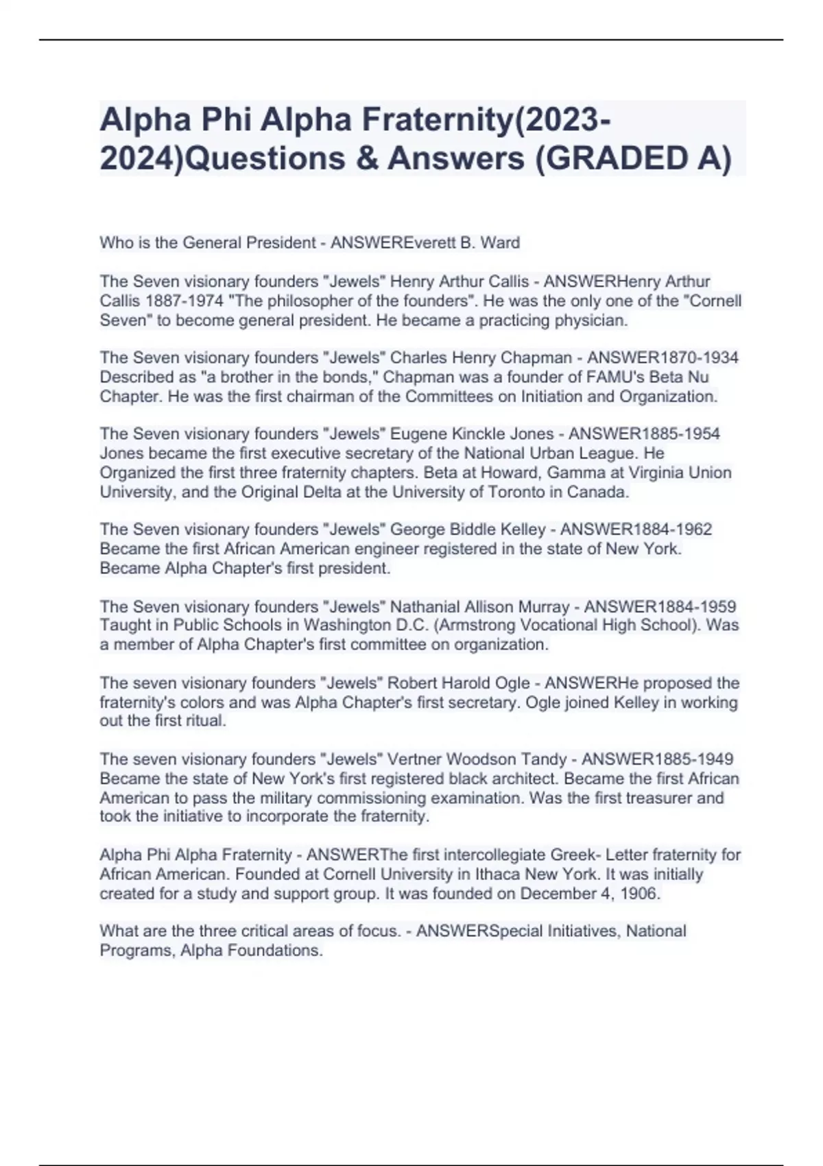Alpha Phi Alpha Fraternity()Questions & Answers (GRADED A)