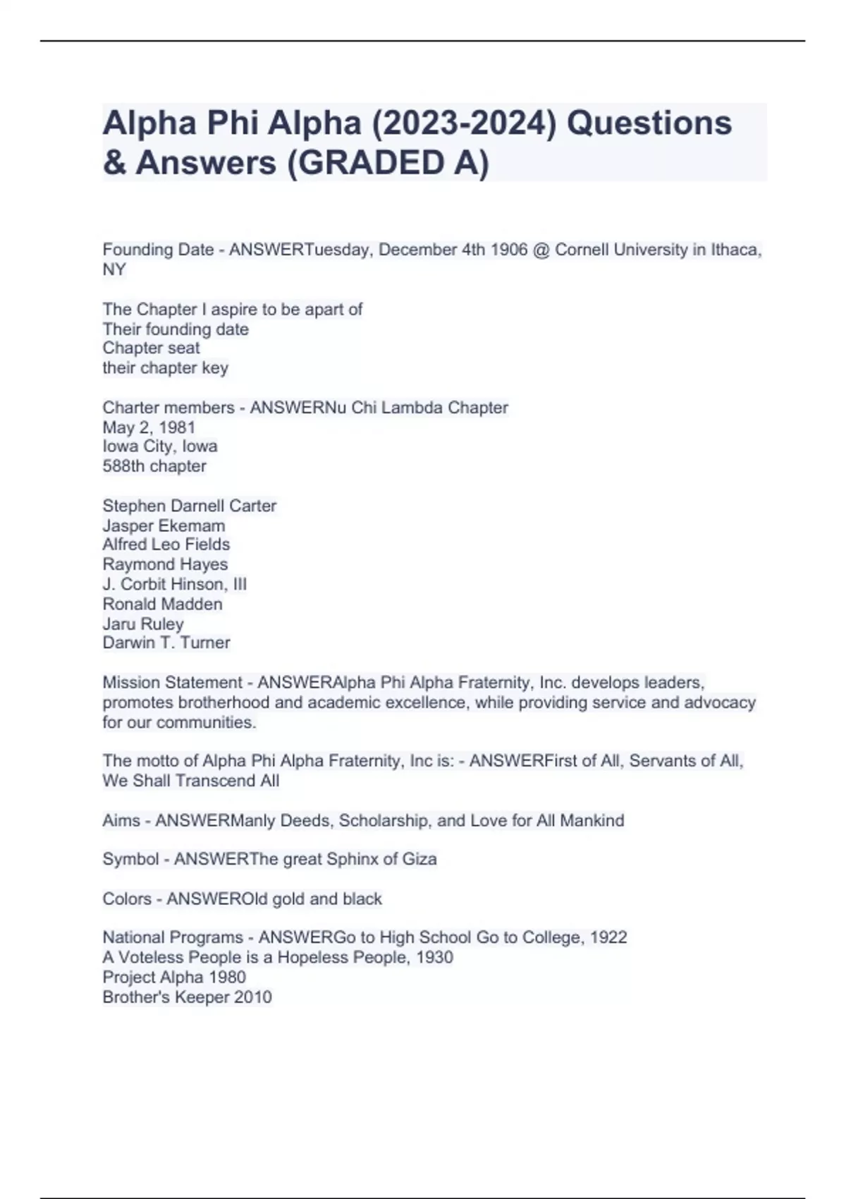 Alpha Phi Alpha () Questions & Answers (GRADED A)