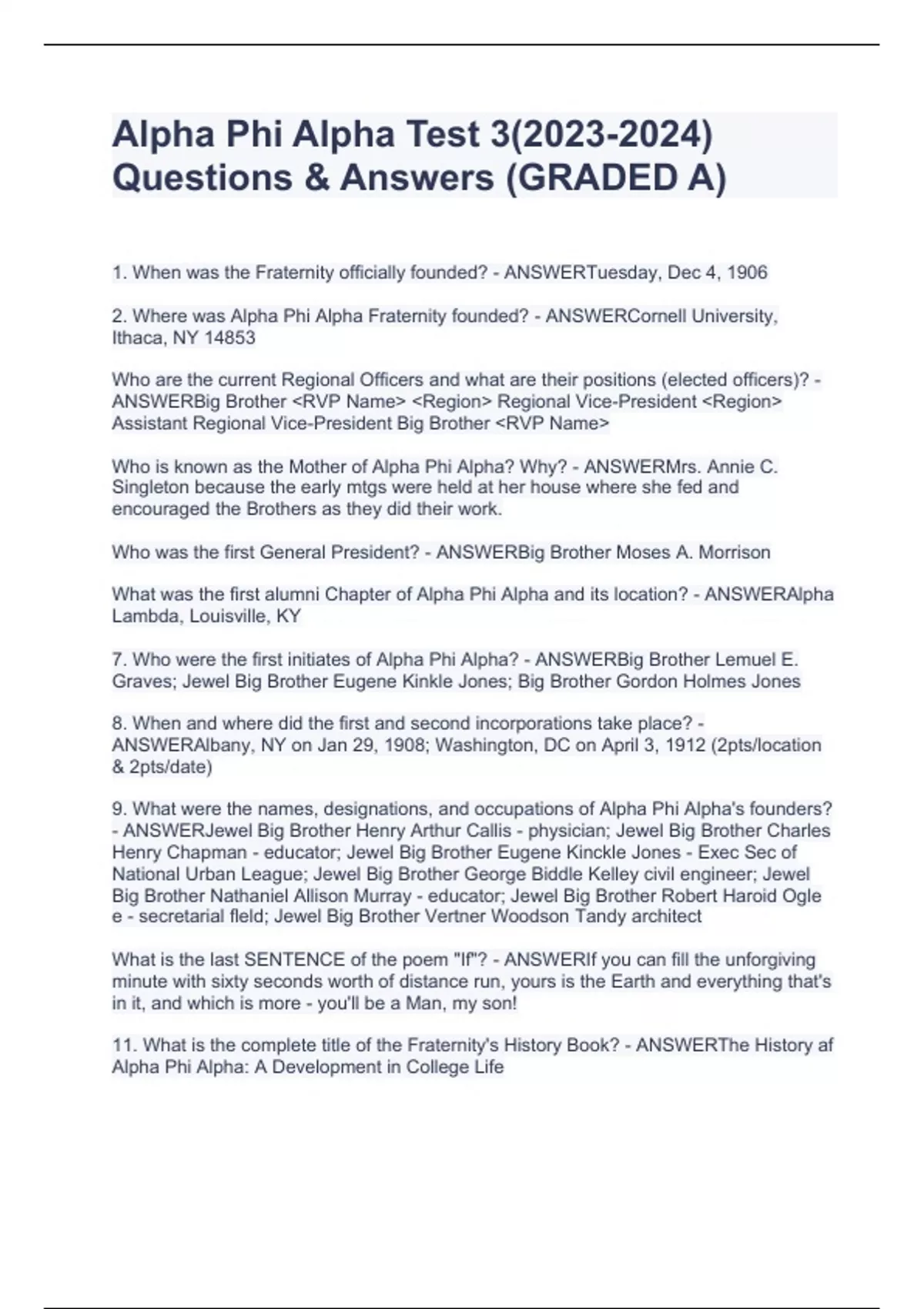 1. When was the Fraternity officially founded? - ANSWERTuesday, Dec 4, 1906 2. Where was Alpha Phi Alpha Fraternity founded? - ANSWERCornell University, Ithaca, NY 14853 Who are the current Regional Officers and what are their positions (elected officers)? - ANSWERBig Brother <RVP Name> <Region> Regional Vice-President <Region> Assistant Regional Vice-President Big Brother <RVP Name> Who is known as the Mother of Alpha Phi Alpha? Why? - ANSWERMrs. Annie C. Singleton because the early mtgs were held at her house where she fed and encouraged the Brothers as they did their work. Who was the first General President? - ANSWERBig Brother Moses A. Morrison What was the first alumni Chapter of Alpha Phi Alpha and its location? - ANSWERAlpha Lambda, Louisville, KY 7. Who were the first initiates of Alpha Phi Alpha? - ANSWERBig Brother Lemuel E. Graves; Jewel Big Brother Eugene Kinkle Jones; Big Brother Gordon Holmes Jones 8. When and where did the first and second incorporations take place? - ANSWERAlbany, NY on Jan 29, 1908; Washington, DC on April 3, 1912 (2pts/location & 2pts/date) 9. What were the names, designations, and occupations of Alpha Phi Alpha's founders? - ANSWERJewel Big Brother Henry Arthur Callis - physician; Jewel Big Brother Charles Henry Chapman - educator; Jewel Big Brother Eugene Kinckle Jones - Exec Sec of National Urban League; Jewel Big Brother George Biddle Kelley civil engineer; Jewel Big Brother Nathaniel Allison Murray - educator; Jewel Big Brother Robert Haroid Ogle e - secretarial fleld; Jewel Big Brother Vertner Woodson Tandy architect What is the last SENTENCE of the poem "If"? - ANSWERIf you can fill the unforgiving minute with sixty seconds worth of distance run, yours is the Earth and everything that's in it, and which is more - you'll be a Man, my son! 11. What is the complete title of the Fraternity's History Book? - ANSWERThe History af Alpha Phi Alpha: A Development in College Life To whom is the History book of Alpha Phi Alpha dedicated? - ANSWERTo the youths who march onward and upward toward the light, this volume is respectfully dedicated