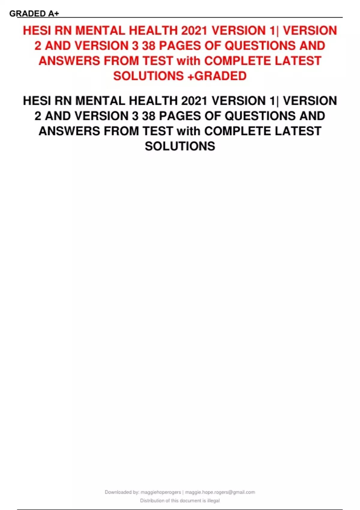 HESI RN MENTAL HEALTH 2021 VERSION 1| VERSION 2 AND VERSION 3 38 PAGES OF QUESTIONS AND ANSWERS FROM TEST With COMPLETE LATEST SOLUTIONS