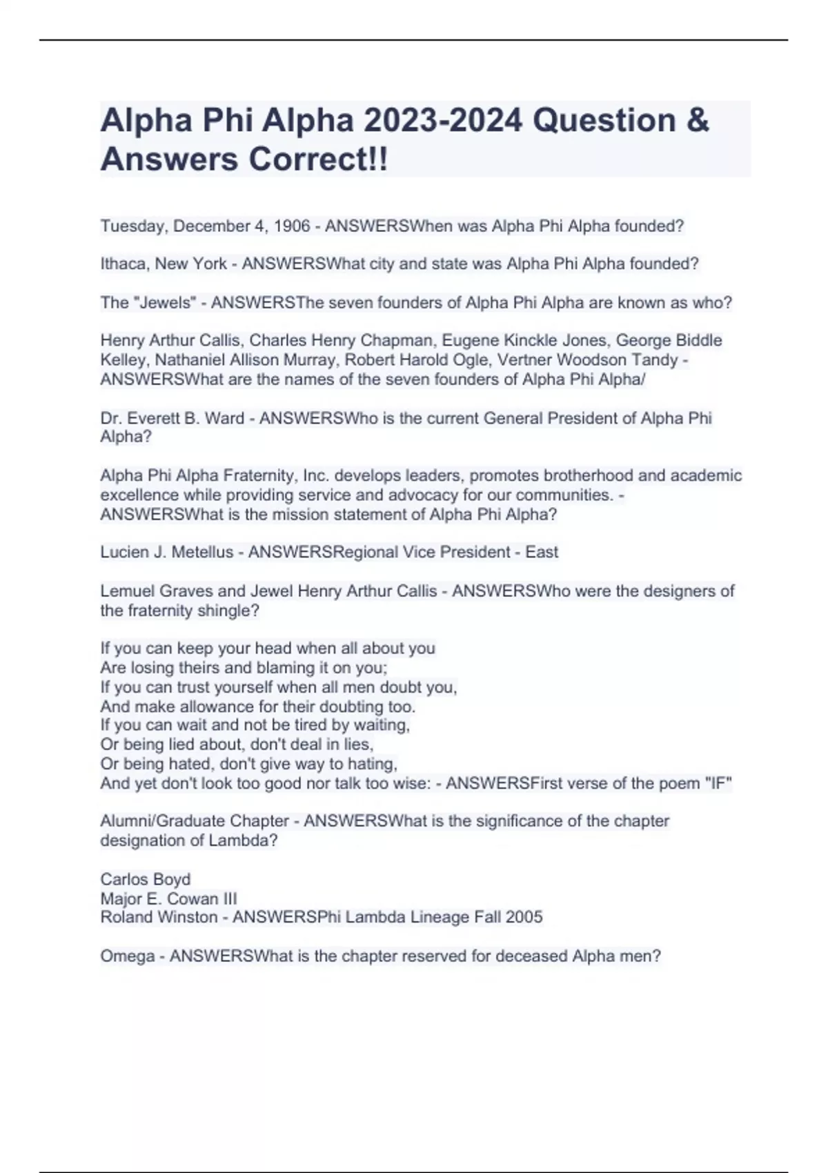 Alpha Phi Alpha Question & Answers Correct!!