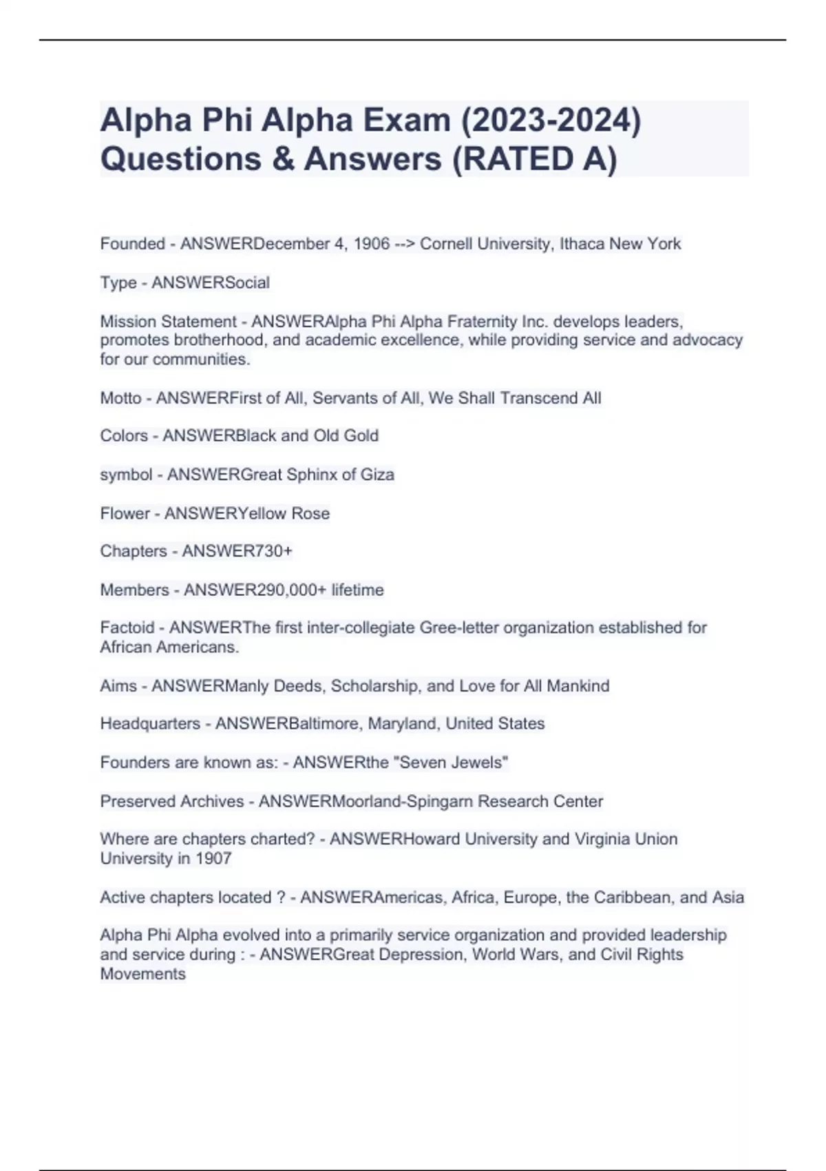 Alpha Phi Alpha Exam () Questions & Answers (RATED A)