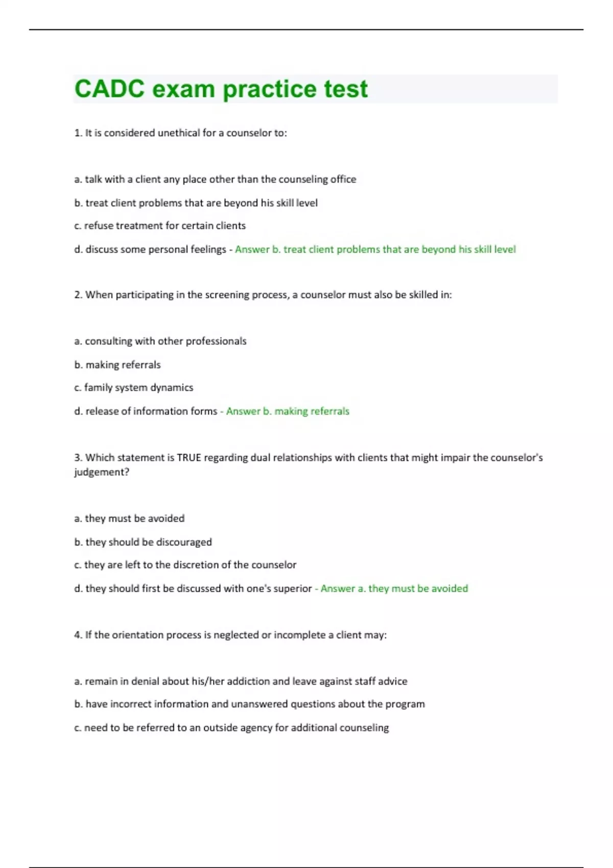 1. It is considered unethical for a counselor to: a. talk with a client any place other than the counseling office b. treat client problems that are beyond his skill level c. refuse treatment for certain clients d. discuss some personal feelings - Answer b. treat client problems that are beyond his skill level 2. When participating in the screening process, a counselor must also be skilled in: a. consulting with other professionals b. making referrals c. family system dynamics d. release of information forms - Answer b. making referrals 3. Which statement is TRUE regarding dual relationships with clients that might impair the counselor's judgement? a. they must be avoided b. they should be discouraged c. they are left to the discretion of the counselor d. they should first be discussed with one's superior - Answer a. they must be avoided 4. If the orientation process is neglected or incomplete a client may: a. remain in denial about his/her addiction and leave against staff advice b. have incorrect information and unanswered questions about the program c. need to be referred to an outside agency for additional counselingd. need additional education about addiction and its effects on the body. - Answer b. have incorrect information and unanswered questions about the program 5. A common error that counselors make when conducting an assessment is: a. processing the data collected from the client b. asking too many questions and interrupting the client c. moving too quickly from data collection to treatment planning d. focusing on strengths and weaknesses rather than relationships - Answer c. moving too quickly from data collection to treatment planning