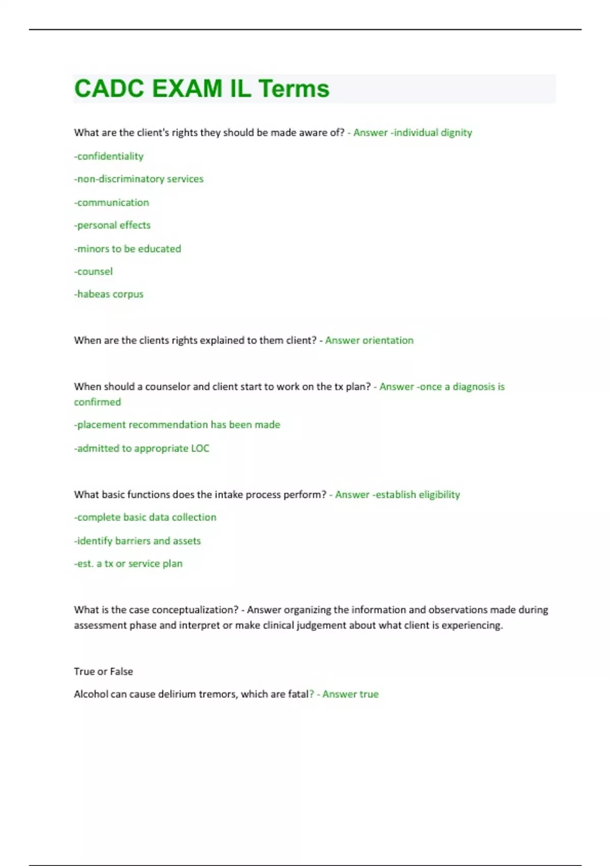 What are the client's rights they should be made aware of? - Answer -individual dignity -confidentiality -non-discriminatory services -communication -personal effects -minors to be educated -counsel -habeas corpus When are the clients rights explained to them client? - Answer orientation When should a counselor and client start to work on the tx plan? - Answer -once a diagnosis is confirmed -placement recommendation has been made -admitted to appropriate LOC What basic functions does the intake process perform? - Answer -establish eligibility -complete basic data collection -identify barriers and assets -est. a tx or service plan What is the case conceptualization? - Answer organizing the information and observations made during assessment phase and interpret or make clinical judgement about what client is experiencing. True or False Alcohol can cause delirium tremors, which are fatal? - Answer trueWhat is the definition of recovery? - Answer Change whereby individuals improve their health and wellness, live a self-directed life and strive to reach their full potential What is a stimulant used for? and what are some common ones? - Answer -treat narcolepsy, ADHD, obesity -dexedrine, ritalin, adderall What stance does recovery management take on recovery? - Answer "relapse is a not inevitable if the ongoing process is actively managed" What neurotransmitter is strongly related to the experiences of pleasure? - Answer dopamine What should a clinician do if they feel someone they are screening or assessing is at risk? - Answer discontinue services and they the client to a medical, psychiatric care of take another safe intervention What is the rate of suicide among alcoholics who are depressed? - Answer over 75% What re the (3) domains for assessment of a suicide risk? - Answer -current SI -history -risk management CURRENT SI SI, Method, Firearms, Hopelessness, substance use, MI HISTORY attempts, family history, psychosocial crises, trauma
