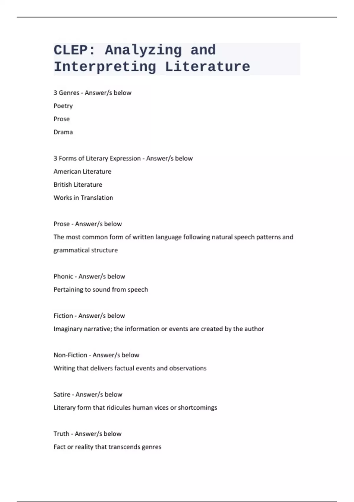 3 Genres - Answer/s below Poetry Prose Drama 3 Forms of Literary Expression - Answer/s below American Literature British Literature Works in Translation Prose - Answer/s below The most common form of written language following natural speech patterns and grammatical structure Phonic - Answer/s below Pertaining to sound from speech Fiction - Answer/s below Imaginary narrative; the information or events are created by the author Non-Fiction - Answer/s below Writing that delivers factual events and observations Satire - Answer/s below Literary form that ridicules human vices or shortcomings Truth - Answer/s below Fact or reality that transcends genres Novel - Answer/s below An extended fictional narrative written in prose that includes characters, plot, and setting Romance - Answer/s below Longer prose narrative, originally associated with the legendary, imaginative and poetic Mode - Answer/s below A broad literary method not tied to one specific form or genre, such as irony or satire i.e. realism, romanticism, impressionism, expressionism, naturalism, or neo- classicism Realism - Answer/s below Delivering subject from third-person objective point of view with no added interpretation or elaboration Romanticism - Answer/s below An artistic and literary movement originating in the second half of the eighteenth century in Europe, emphasizing emotions, idealism, adventure, and chivalry Impressionism - Answer/s below Subjective or personal literary style that relies on associations; style adapted from nineteenth century school of painters including Monet and Renoir Expressionism - Answer/s below Subjective depiction of the real world through imagination, the abstract and symbols Naturalism - Answer/s below Literary movement that depicts life as accurately as possible, illustrating transformation in society through environment and hereditary. Neo-classicism - Answer/s below A style of prose and poetry from the 17th and 18th centuries, reviving a classical style from Greek and Roman cultures. Static - Answer/s below A character who stays the same throughout a literary work. Dynamic - Answer/s below A character whose personality changes over the course of a narrative or who has the ability for such a change Protagonist - Answer/s below Main character in a literary work; literally, one who struggles toward or for something Antagonist - Answer/s below The one who struggles against or contends with the protagonist; the antagonist may be another individual or an obstacle or challenge, such as fear or death Stock - Answer/s below A well understood and accepted interpretation of an image, symbol or character; a character who exists for necessity of a plot Stereotype - Answer/s below A popularly held belief about a particular group of individuals Foil - Answer/s below A character who highlights through contrast opposite characteristics in another character Allegorical - Answer/s below A narrative that is an extended metaphor; the elements of the narrative carry significance on a literal and figurative level Theme - Answer/s below Statement summarizing the message or the big idea of a story Topic - Answer/s below Phrase stating subject or theme of a work or speech Motif - Answer/s below An object, concept or structure repeated in a literary work; thereby giving it symbolic significance in the story Point of View - Answer/s below The perspective or vantage point from which the author chooses to tell the story 4 Categories of Essays - Answer/s below speculative, argumentative, narrative, and expository Speculative - Answer/s below Writing or discourse that explores ideas Argumentative - Answer/s below Describes writing - usually an essay - that establishes a position and supports it with evidence Narrative - Answer/s below Has speculative and arguementative; the events that tell the story Expository - Answer/s below