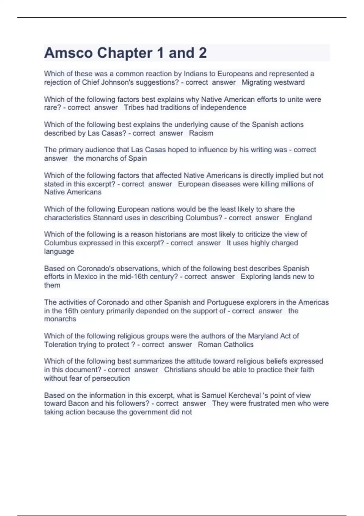 Amsco Chapter 1 and 2 Que Which of these was a common reaction by Indians to Europeans and represented a rejection of Chief Johnson's suggestions? - correct answer Migrating westward Which of the following factors best explains why Native American efforts to unite were rare? - correct answer Tribes had traditions of independence Which of the following best explains the underlying cause of the Spanish actions described by Las Casas? - correct answer Racism The primary audience that Las Casas hoped to influence by his writing was - correct answer the monarchs of Spain Which of the following factors that affected Native Americans is directly implied but not stated in this excerpt? - correct answer European diseases were killing millions of Native Americans stion and answers already passed 2023/2024