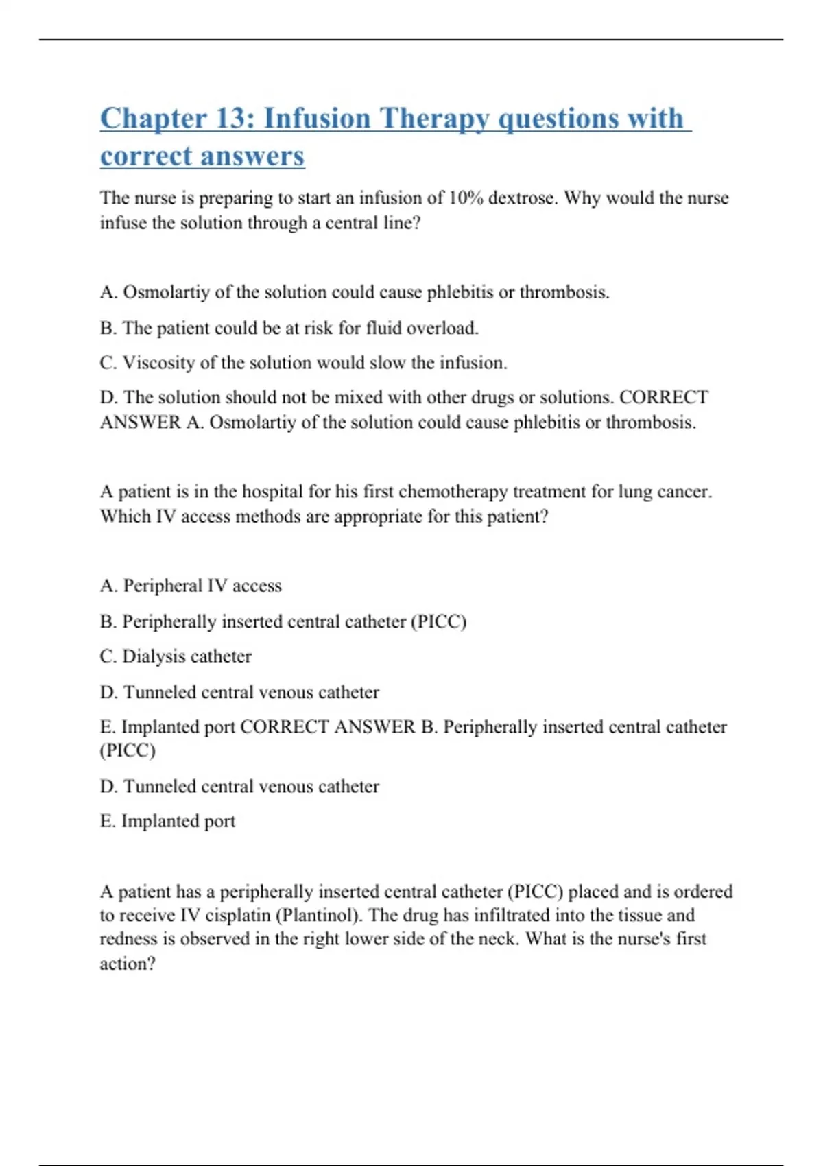 The nurse is preparing to start an infusion of 10% dextrose. Why would the nurse infuse the solution through a central line? A. Osmolartiy of the solution could cause phlebitis or thrombosis. B. The patient could be at risk for fluid overload. C. Viscosity of the solution would slow the infusion. D. The solution should not be mixed with other drugs or solutions. CORRECT ANSWER A. Osmolartiy of the solution could cause phlebitis or thrombosis. A patient is in the hospital for his first chemotherapy treatment for lung cancer. Which IV access methods are appropriate for this patient? A. Peripheral IV access B. Peripherally inserted central catheter (PICC) C. Dialysis catheter D. Tunneled central venous catheter E. Implanted port CORRECT ANSWER B. Peripherally inserted central catheter (PICC) D. Tunneled central venous catheter E. Implanted port A patient has a peripherally inserted central catheter (PICC) placed and is ordered to receive IV cisplatin (Plantinol). The drug has infiltrated into the tissue and redness is observed in the right lower side of the neck. What is the nurse's first action?