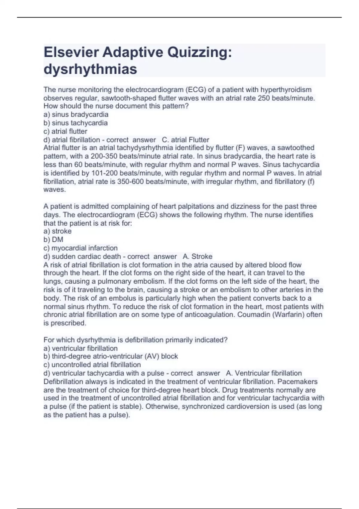 Elsevier Adaptive The nurse monitoring the electrocardiogram (ECG) of a patient with hyperthyroidism observes regular, sawtooth-shaped flutter waves with an atrial rate 250 beats/minute. How should the nurse document this pattern? a) sinus bradycardia b) sinus tachycardia c) atrial flutter d) atrial fibrillation - correct answer C. atrial Flutter Atrial flutter is an atrial tachydysrhythmia identified by flutter (F) waves, a sawtoothed pattern, with a 200-350 beats/minute atrial rate. In sinus bradycardia, the heart rate is less than 60 beats/minute, with regular rhythm and normal P waves. Sinus tachycardia is identified by 101-200 beats/minute, with regular rhythm and normal P waves. In atrial fibrillation, atrial rate is 350-600 beats/minute, with irregular rhythm, and fibrillatory (f) waves. Quizzing Questions with complete solution 2023/2024