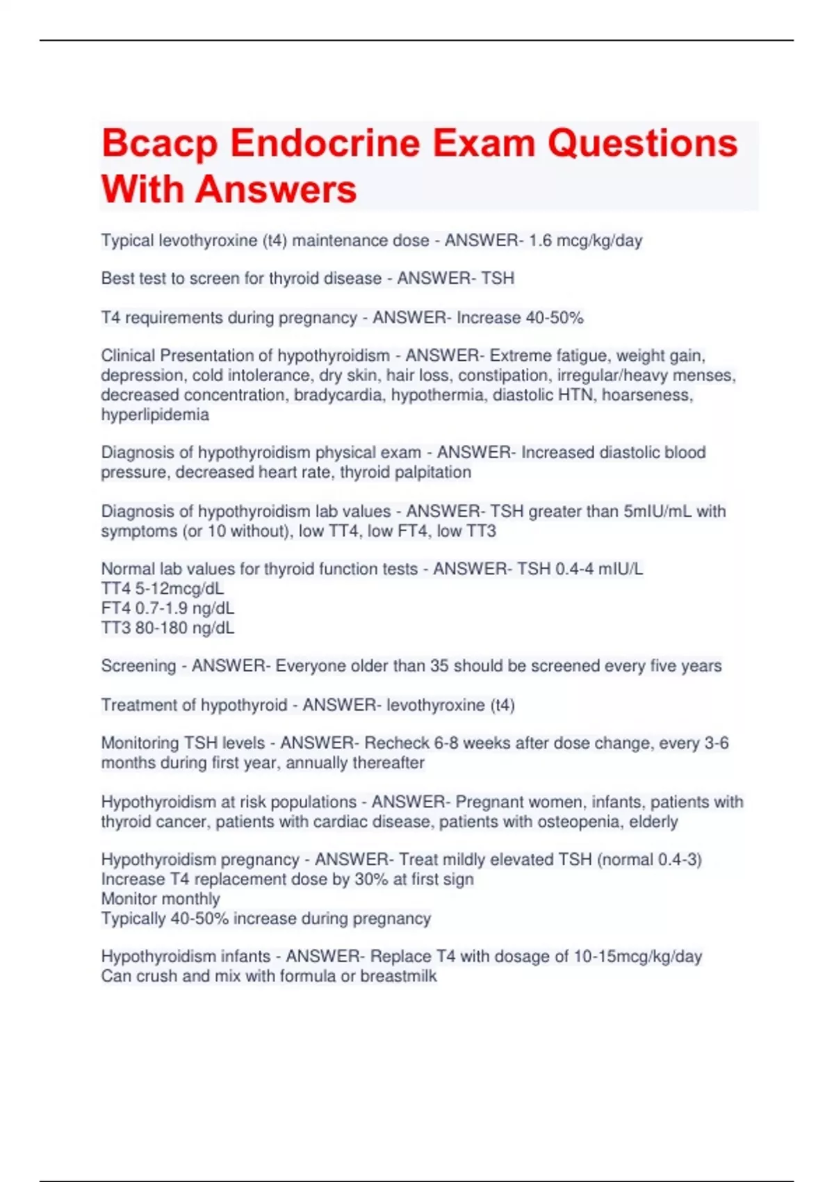 Bcacp Endocrine Exam Questions With Answers Typical levothyroxine (t4) maintenance dose - ANSWER- 1.6 mcg/kg/day Best test to screen for thyroid disease - ANSWER- TSH T4 requirements during pregnancy - ANSWER- Increase 40-50% Clinical Presentation of hypothyroidism - ANSWER- Extreme fatigue, weight gain, depression, cold intolerance, dry skin, hair loss, constipation, irregular/heavy menses, decreased concentration, bradycardia, hypothermia, diastolic HTN, hoarseness, hyperlipidemia Diagnosis of hypothyroidism physical exam - ANSWER- Increased diastolic blood pressure, decreased heart rate, thyroid palpitation Diagnosis of hypothyroidism lab values - ANSWER- TSH greater than 5mIU/mL with symptoms (or 10 without), low TT4, low FT4, low TT3 Normal lab values for thyroid function tests - ANSWER- TSH 0.4-4 mIU/L TT4 5-12mcg/dL FT4 0.7-1.9 ng/dL TT3 80-180 ng/dL Screening - ANSWER- Everyone older than 35 should be screened every five years Treatment of hypothyroid - ANSWER- levothyroxine (t4) Monitoring TSH levels - ANSWER- Recheck 6-8 weeks after dose change, every 3-6 months during first year, annually thereafter Hypothyroidism at risk populations - ANSWER- Pregnant women, infants, patients with thyroid cancer, patients with cardiac disease, patients with osteopenia, elderly Hypothyroidism pregnancy - ANSWER- Treat mildly elevated TSH (normal 0.4-3) Increase T4 replacement dose by 30% at first sign Monitor monthly Typically 40-50% increase during pregnancy Hypothyroidism infants - ANSWER- Replace T4 with dosage of 10-15mcg/kg/day Can crush and mix with formula or breastmilk Hypothyroidism with thyroid cancer - ANSWER- Target TSH 0.1-0.2 Hypothyroidism with preexisting cardiac disease - ANSWER- Start with low dose 12.5mcg and increase in 12.5mcg increments ever 6-8 weeks T4 drug interactions (decrease absorption) - ANSWER- Cholestyramine, calcium, ferrous sulfate, sucralfate, aluminum hydroxide, magnesium, zinc, MTV T4 drug interactions (increase in metabolism) - ANSWER- Rifampin, phenytoin, phenobarbital, sertraline T4 drug interactions (pharmacodynamic) - ANSWER- Warfarin-decreased drug activity in hypothyroidism (need higher dose) Digoxin-increases drug activity in hypothyroidism (need lower dose) Other thyroid preparations - ANSWER- Desiccated thyroid hormone Triiodothyronine (cytomel, triostat) Synthetic T4/T3 (liotrix) Desiccated Thyroid (Armour Thyroid) - ANSWER- Variable amount of iodine Potential for allergic reaction Potential of thyrotoxicosis-contains T3 Triiodothyronine (T3) - ANSWER- Greater potential for cardiac effects Short half life Must monitor T3 25mcg equivalent to 60-100 mcg T4 Hyperthyroidism - ANSWER- excessive activity of the thyroid gland Hyperthyroidism clinical presentation - ANSWER- Heat intolerance, tremor, palpitation, systolic HTN, nervousness, frequent bowel movement, less frequent/lighter menses, fatigue and muscle weakness, goiter, weight loss, insomnia Hyperthyroidism lab values - ANSWER- Low TSH High TT4 High FT4 High TT3 Hyperthyroidism treatment - ANSWER- Radioactive Iodine If Not Pregnant* PTU (Prevents T4 to T3 Conversion) - High Risk of Hepatotoxicity Methimazole and Carbimazole Thioamides-PTU mechanism of action - ANSWER- Inhibits the peripheral conversion of T4-T3 Delayed effect(weeks) Dosed 300-600mg/day Thioamides adverse effects - ANSWER- agranulocytosis vasculitis Also: rash, arthralgia, hepatotoxicity, vasculitis, lupus thioamides (methimazole) - ANSWER- 30-60 mg/day Less hepatotoxic Do not use in first trimester/lactating/thyroid storm Iodides MOA - ANSWER- Block thyroid hormone release Inhibit the peripheral conversion of T4 to T3 *Decrease gland size/vascularity* Rapid onset (2-7 days) Iodides adverse effects - ANSWER- 1. Hypersensitivity reactions 2. Dose-related toxicity ("iodism") -Metallic taste, burning mouth and throat, sore teeth and gums, head cold symptoms, stomach upset, diarrhea 3. Salivary gland swellin