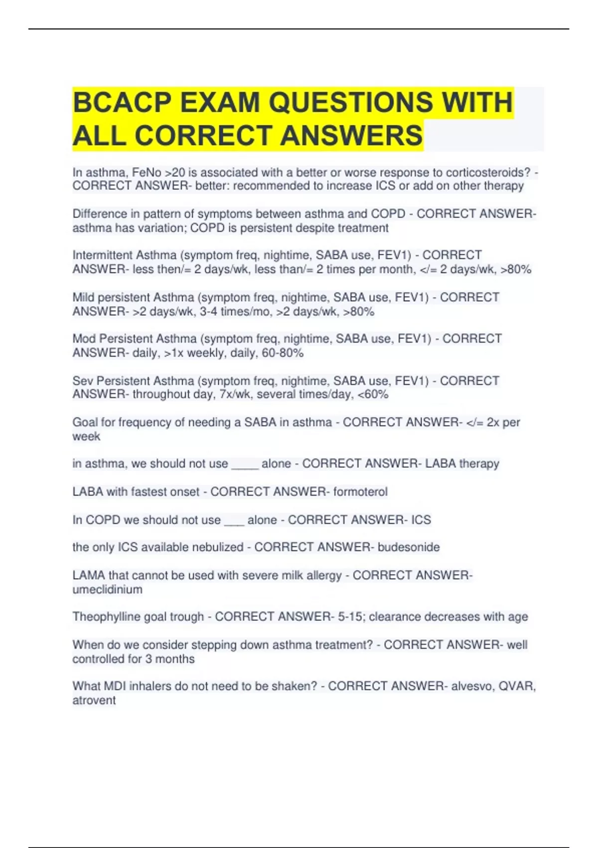 BCACP EXAM QUESTIONS WITH ALL CORRECT ANSWERS In asthma, FeNo >20 is associated with a better or worse response to corticosteroids? - CORRECT ANSWER- better: recommended to increase ICS or add on other therapy Difference in pattern of symptoms between asthma and COPD - CORRECT ANSWERasthma has variation; COPD is persistent despite treatment Intermittent Asthma (symptom freq, nightime, SABA use, FEV1) - CORRECT ANSWER- less then/= 2 days/wk, less than/= 2 times per month, </= 2 days/wk, >80% Mild persistent Asthma (symptom freq, nightime, SABA use, FEV1) - CORRECT ANSWER- >2 days/wk, 3-4 times/mo, >2 days/wk, >80% Mod Persistent Asthma (symptom freq, nightime, SABA use, FEV1) - CORRECT ANSWER- daily, >1x weekly, daily, 60-80% Sev Persistent Asthma (symptom freq, nightime, SABA use, FEV1) - CORRECT ANSWER- throughout day, 7x/wk, several times/day, <60% Goal for frequency of needing a SABA in asthma - CORRECT ANSWER- </= 2x per week in asthma, we should not use ____ alone - CORRECT ANSWER- LABA therapy LABA with fastest onset - CORRECT ANSWER- formoterol In COPD we should not use ___ alone - CORRECT ANSWER- ICS the only ICS available nebulized - CORRECT ANSWER- budesonide LAMA that cannot be used with severe milk allergy - CORRECT ANSWERumeclidinium Theophylline goal trough - CORRECT ANSWER- 5-15; clearance decreases with age When do we consider stepping down asthma treatment? - CORRECT ANSWER- well controlled for 3 months What MDI inhalers do not need to be shaken? - CORRECT ANSWER- alvesvo, QVAR, atrovent respimat education: when to prime - CORRECT ANSWER- spray 1 puff if not used in 3 days; spray 3x if not used for 21 days GOLD grades 1-4 according to FEV1 - CORRECT ANSWER- 1: >/= 80% 2: 50-79% 3: 30-49% 4: <30% COPD treatment according to pt groups A-D - CORRECT ANSWER- A: SAMA/SABA/LAMA/LABA B: LABA or LAMA C: LAMA D: LAMA or LABA+LAMA or ICS+LABA When to use steroids based on eosinophil count - CORRECT ANSWER- <100: little effect >300: likely effect COPD exacerbation steroid dose - CORRECT ANSWER- 40 mg x 5 days 3 cardinal copd symptoms - CORRECT ANSWER- 1. Increased dyspnea 2. Increased sputum 3. Increased sputum purulence When to give antibiotics in COPD - CORRECT ANSWER- If all 3 cardinal symptoms present OR Increased sputum purulence + 1 other Antibiotics choice and duration in COPD - CORRECT ANSWER- 5-10 days Uncomplicated: azith, clarith, doxy, amox Complicated: augmentin, levo, moxi Pseudomonas: high dose levo (750 mg) or cipro 5 A's of smoking cessation: ask at every visit - CORRECT ANSWER- Ask Advice Assess Assist Arrange Set a quit date within ______days/weeks - CORRECT ANSWER- 2 weeks Quit plan "STAR" - CORRECT ANSWER- Set a quit date Tell family/friends Anticipate challenges Remove tobacco Which smoking cessation agent has BBW of SI/mood changes - CORRECT ANSWERvarenicline Bupropion, varenicline, and NRT all _____ weight gain - CORRECT ANSWER- delay but do not prevent weight gain Dosing schedule for nicotine replacement patches and when to use 21 mg vs 14 mg - CORRECT ANSWER- 21 mg x6 wks, 14 mgx2 wks, 7 mg x 2 wks 21 mg = >10 cigs/day 14 mg = <10 cigs Which smoking cessation agent has contrainidication for hx of seizure, eating disorder, MAOI use? - CORRECT ANSWER- Bupropion Diagnosis for diabetes is made by: - CORRECT ANSWER- 2 abnormal results of the SAME sample (FPG and A1c) or in 2 separate samples *if pt is symptomatic, diagnosis can be made without a 2nd diagnostic test FPG cutoffs for prediab and diabetes - CORRECT ANSWER- pre-diabetes: 100-125 mg/dL Diabetes: >/= 126 mg/dL OGTT cutoff for prediab and diabetes - CORRECT ANSWER- pre-diabetes: 140-199 mg/dL Diabetes: >/= 200 mg/d
