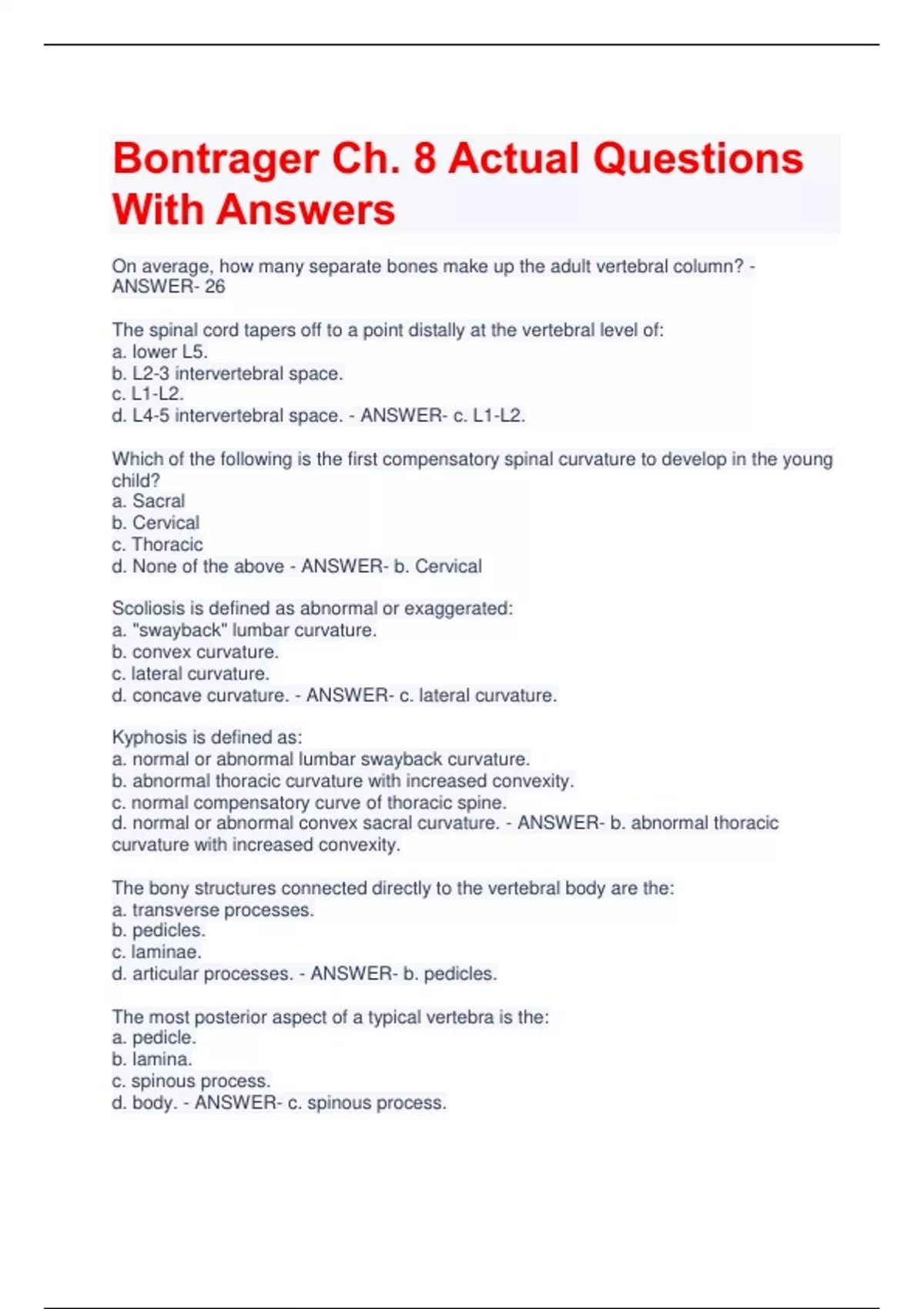 Bontrager Ch. 8 Actual Questions With Answers On average, how many separate bones make up the adult vertebral column? - ANSWER- 26 The spinal cord tapers off to a point distally at the vertebral level of: a. lower L5. b. L2-3 intervertebral space. c. L1-L2. d. L4-5 intervertebral space. - ANSWER- c. L1-L2. Which of the following is the first compensatory spinal curvature to develop in the young child? a. Sacral b. Cervical c. Thoracic d. None of the above - ANSWER- b. Cervical Scoliosis is defined as abnormal or exaggerated: a. "swayback" lumbar curvature. b. convex curvature. c. lateral curvature. d. concave curvature. - ANSWER- c. lateral curvature. Kyphosis is defined as: a. normal or abnormal lumbar swayback curvature. b. abnormal thoracic curvature with increased convexity. c. normal compensatory curve of thoracic spine. d. normal or abnormal convex sacral curvature. - ANSWER- b. abnormal thoracic curvature with increased convexity. The bony structures connected directly to the vertebral body are the: a. transverse processes. b. pedicles. c. laminae. d. articular processes. - ANSWER- b. pedicles. The most posterior aspect of a typical vertebra is the: a. pedicle. b. lamina. c. spinous process. d. body. - ANSWER- c. spinous process. The joints between articular processes of vertebra are termed: a. zygapophyseal joints. b. synarthrodial joints. c. intervertebral joints. d. fibrous joints - ANSWER- a. zygapophyseal joints. Which of the following thoracic vertebra(e) possess no facets for costotransverse joints? a. T1 b. T11-12 c. None of the above d. T10-12 - ANSWER- b. T11-12 The zygapophyseal joints for the typical cervical vertebra lie at an angle of ____ in relation to the midsagittal plane. a. 70 to 75 degrees b. 60 degrees c. 90 degrees d. 45 degrees - ANSWER- c. 90 degrees The most prominent aspect of the thyroid carilage corresponds to the vertebral level of: a. C1-2. b. C4-6. c. C6-7. d. C7-T1. - ANSWER- b. C4-6. The zygapophyseal joints for the thoracic spine lie at an angle of ____ in relation to the midsagittal plane. a. 90 degrees b. 70 to 75 degrees c. 45 degrees d. 60 degree - ANSWER- b. 70 to 75 degrees T2-3 intervertebral disk space is found at the level of the: a. 2 inches (5 cm) below the jugular notch. b. jugular notch. c. xiphoid process. d. sternal angle. - ANSWER- b. jugular notch. The gonion corresponds to the level of: a. C7. b. C1. c. C4-5. d. C3. - ANSWER- d. C3. The xiphoid process corresponds to the vertebral level of: a. T8 b. T10 c. T7 d. T12 - ANSWER- b. T10 Along with increasing the source image receptor distance (SID), what other factor(s) will improve spatial resolution for lateral and oblique projections of the cervical spine? a. using a small focal spot b. using a large focal spot c. collimation d. none of the above - ANSWER- a. using a small focal spot Along with the upper incisors, what other bony landmarks must be aligned for the AP open-mouth projection? a. Base of skull b. Tip of mandible c. Inferior margin of lower incisors d. Thyroid cartilage - ANSWER- a. Base of skull How much CR angulation is required for the AP axial projection for the cervical spine? a. CR is perpendicular to the image receptor b. 5 to 10 degrees cephalad c. 15 to 20 degrees cephalad d. 15 to 20 degrees caudad - ANSWER- c. 15 to 20 degrees cephalad Why are the anterior oblique projections (RAO/LAO) preferred over the posterior oblique projections of the cervical spine? a. More comfortable for the patient b. Less thyroid and breast dose c. Prevent overlap of the mandible over the spine d. Place the zygapophyseal joints closer to the image receptor - ANSWER- b. Less thyroid and breast dose Which of the following positions will demonstrate the left intervertebral foramina of the cervical spine? a. RAO b. LPO c. Lateral d. LAO - ANSWER- a. RAO Which of the following positions will best demonstrate the zygapophyseal joints of the cervical spine? a. AP axial b. Posterior obliques c. Lateral d. Anterior obliques - ANSWER- c. Lateral