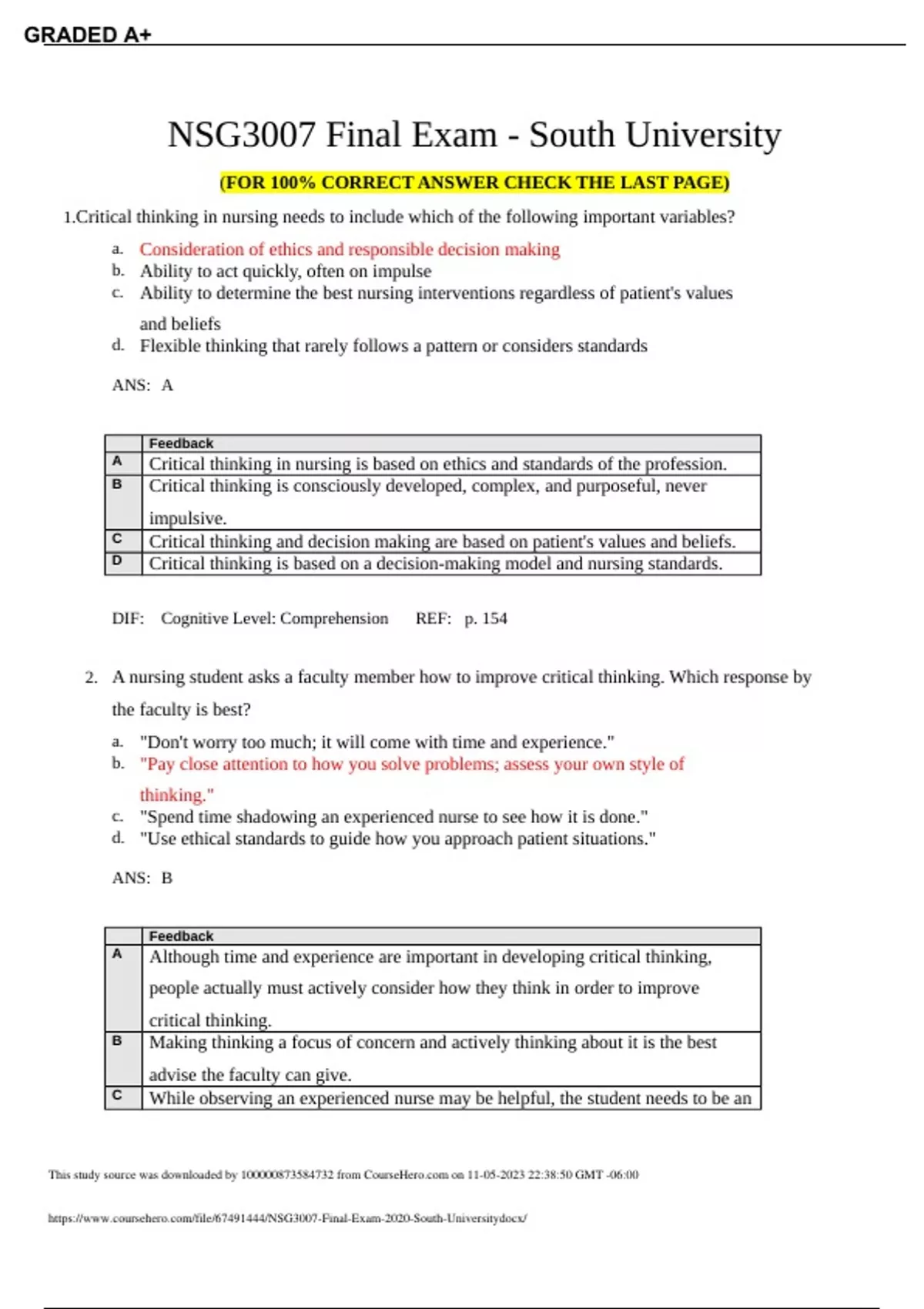 1.Critical thinking in nursing needs to include which of the following important variables? a. Consideration of ethics and responsible decision making b. Ability to act quickly, often on impulse c. Ability to determine the best nursing interventions regardless of patient's values and beliefs d. Flexible thinking that rarely follows a pattern or considers standards ANS: A Feedback A Critical thinking in nursing is based on ethics and standards of the profession. B Critical thinking is consciously developed, complex, and purposeful, never impulsive. C Critical thinking and decision making are based on patient's values and beliefs. D Critical thinking is based on a decision-making model and nursing standards. DIF: Cognitive Level: Comprehension REF: p. 154 2. A nursing student asks a faculty member how to improve critical thinking. Which response by the faculty is best? a. "Don't worry too much; it will come with time and experience." b. "Pay close attention to how you solve problems; assess your own style of thinking." c. "Spend time shadowing an experienced nurse to see how it is done." d. "Use ethical standards to guide how you approach patient situations." ANS: B Feedback A Although time and experience are important in developing critical thinking, people actually must actively consider how they think in order to improve critical thinking. B Making thinking a focus of concern and actively thinking about it is the best advise the faculty can give. C While observing an experienced nurse may be helpful, the student needs to be an This study source was downloaded by from CourseH on :38:50 GMT -06:00 GRADED A+ active participant to improve critical thinking. D Using ethical and professional standards is a part of critical thinking, but that is only a portion of what makes a good critical thinker. DIF: Cognitive Level: Analysis REF: p. 154 3. Which of the following is a characteristic of an accomplished critical thinker? a. Inquisitiveness b. Narrow focus c. Unaffected by other arguments d. Quick decision making ANS: A Feedback A The accomplished critical thinker needs to ask questions when things do not seem quite right. B The accomplished critical thinker thinks broadly, considering all possibilities. C The accomplished critical thinker considers all information and all arguments before deciding on a course of action. D The accomplished critical thinker considers the facts, fits them into known patterns, considers all aspects of the problem, and makes decisions based on knowledge, not on instinct. DIF: Cognitive Level: Comprehension REF: p. 153 4. Which of the following statements describes the purpose of the nursing process? a. Process of documentation designed to decrease liability b. Process designed to maximize reimbursement potential c. A sophisticated time-management strategy d. Process used to identify and solve patient problems ANS: D Feedback A Although proper documentation is part of the nursing process, it is a problemsolving process, not a documentation process. B The nursing process is not used with reimbursement potential in mind. This study source was downloaded by from CourseH on :38:50 GMT -06:00 GRADED A+ C The nursing process is not a time-management strategy. D The purpose of the nursing process is to identify and solve patient problems. DIF: Cognitive Level: Knowledge REF: p. 156 5. Which of the following is considered subjective data in information gathering from the patient? a. Pulse and blood pressure measurements b. ECG pattern c. Diaphoresis d. Pain ANS: D Feedback A Pulse rate and blood pressure measurements are signs or objective data that can be confirmed by observation. B The ECG pattern is objective data. C Diaphoresis is objective data. D Subjective data are the patient's perceptions, sometimes called "symptoms." DIF: Cognitive Level: Comprehension REF: p. 157 6. A nursing student is complaining about writing care plans. Which response by the faculty is best to help the student see the importance of this activity? a. "Using the nursing process will help nurses get reimbursement for their services." b. "You need a written plan of care so everyone is on the same page as you are." c. "The nursing process is a way to systematically think about and use patient data." d. "Most state nurse practice acts require them, so you need to learn how to do them." ANS: C