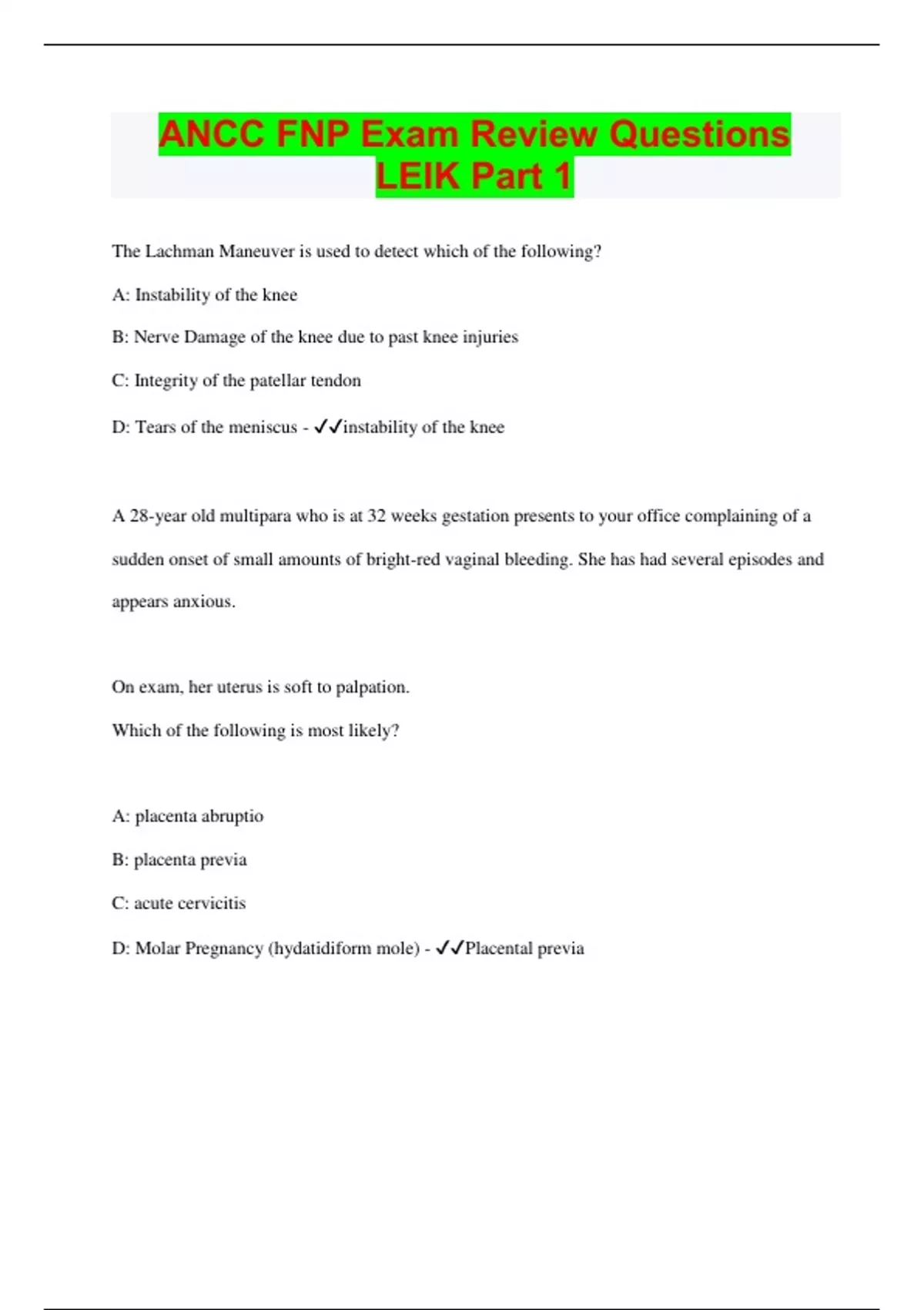 ANCC FNP Exam Review Questions LEIK Part 1 | Questions with 100% Correct Answers | Latest Update 2024 | Verified