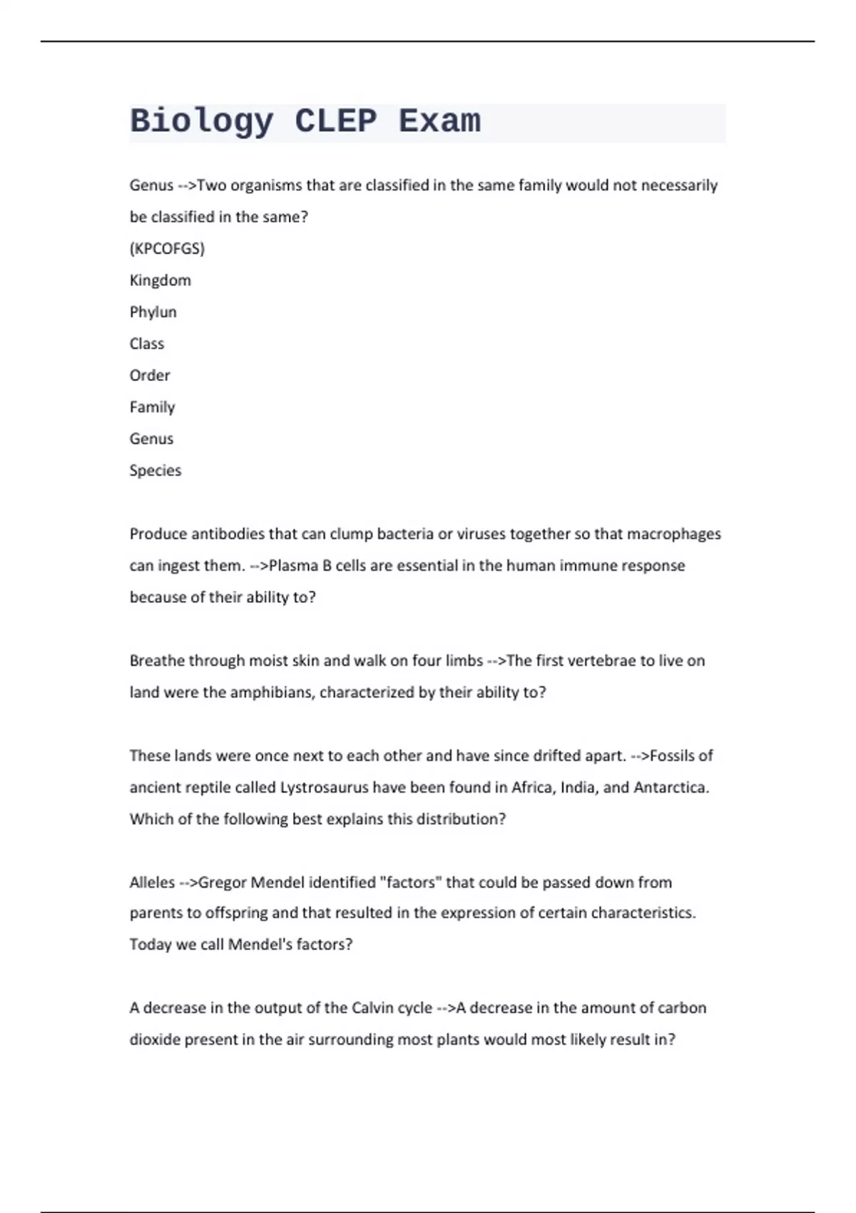 Genus -->Two organisms that are classified in the same family would not necessarily be classified in the same? (KPCOFGS) Kingdom Phylun Class Order Family Genus Species Produce antibodies that can clump bacteria or viruses together so that macrophages can ingest them. -->Plasma B cells are essential in the human immune response because of their ability to? Breathe through moist skin and walk on four limbs -->The first vertebrae to live on land were the amphibians, characterized by their ability to? These lands were once next to each other and have since drifted apart. -->Fossils of ancient reptile called Lystrosaurus have been found in Africa, India, and Antarctica. Which of the following best explains this distribution? Alleles -->Gregor Mendel identified "factors" that could be passed down from parents to offspring and that resulted in the expression of certain characteristics. Today we call Mendel's factors? A decrease in the output of the Calvin cycle -->A decrease in the amount of carbon dioxide present in the air surrounding most plants would most likely result in? Oviduct -->Fertilization of a human ovum normally occurs in the? GCAUCA DNA (A=T G=C) base pairs RNA (A=U G=C) -->A DNA strand has a base sequence of CGTAGT the mRNA strand transcribed from this DNA is? They do not produce enough insuline to absorb sugar from the bloodstream -- >Diabetics may have sugar in their urine because? Diarrhea -->Damage to the cells lining the large intestine would likely result in?? Mitochondrion -->The area of this cell in which a chemiosmotic hydrogenbion gradient is used to produce ATP or energy is ? Under bright white light -->Experments involving the reduction of the blue dye DPIP which loses its blue color and becomes clear as it absorbs electrons have shown that the dye shows the greatest loss of color when in the presence of chloropast? As a bicarbonate ion -->In humans carbon dioxide in the bloodstream is mainly transported from cells to lungs? Bacterium -->A newly discovered organism has ribosomes that can be inhibited by tge antibiotic Streptomycin as well as free fliating DNA not enclosed within a nuclear membrane. This organism is moat likely a? Centrioles -->In or around the cells of flowering plants one woukd expect to find all of the following EXCEPT? Transitional fossils such ad Archaeopteryx have been discovered. -->The best current evidence that modern day birds evolved from certain lineages of dinosaurs or other repiles may be supplied by the fact that? A rapid decrease in the ability of the axon to conduct an action potential -- >Malfunctioning sodium (Na+) potassium (K+) pumps along a neurons axon would likely result in? Follicle simulating hormone ..regulates sperm production -->Which of the following hormones is correctly linked to its function in mammals? Digestion -->The process of breaking food particles into the macromolecules that make them up is called? Chloroplast -->In a plant cell the reactions of photosynthesis take place within the? Specialized vascular tissues -->Mosses can not grow very tall due to their lack of? Parasitism -->Two plants (A and B) of different species are growing together in the same pot. When plant A is removed and grown in a separate pot, it rapidly grows much taller than it had been before, while plant B dies. Which term describes the type of relationship that plants A and B most likely had? Rr...red -->Red plants (R) are dominant to green plants (r). Crossing homozygous (RR) red plants with homozygous (rr) green plants would result in which of the following phenotype/ genotype combinations? Antibodies -->Proteins that bind to the surfaces of pathogens and help to destroy the pathogens are known as? Mammary glands -->Mammals share all of the following characteristics with other vertabrates EXCEPT?
