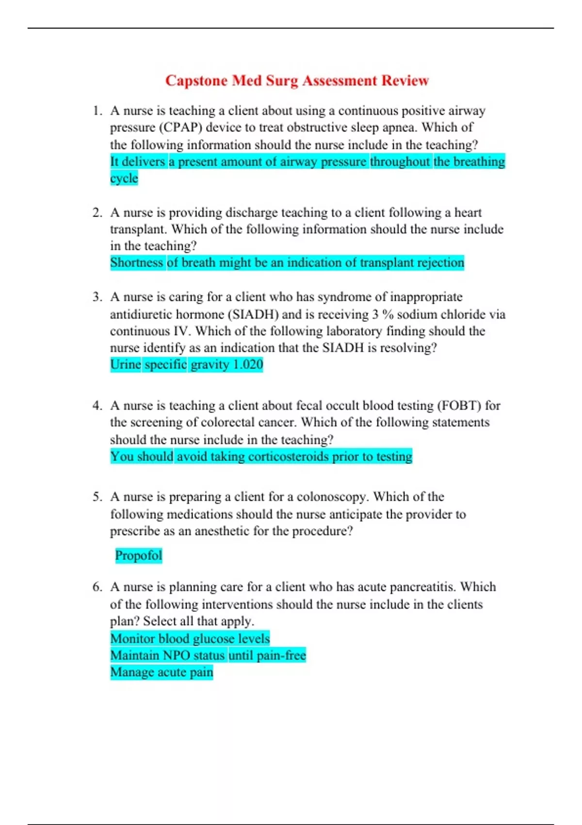 Capstone Med Surg Assessment Review 1. A nurse is teaching a client about using a continuous positive airway pressure (CPAP) device to treat obstructive sleep apnea. Which of the following information should the nurse include in the teaching? It delivers a present amount of airway pressure throughout the breathing cycle 2. A nurse is providing discharge teaching to a client following a heart transplant. Which of the following information should the nurse include in the teaching? Shortness of breath might be an indication of transplant rejection 3. A nurse is caring for a client who has syndrome of inappropriate antidiuretic hormone (SIADH) and is receiving 3 % sodium chloride via continuous IV. Which of the following laboratory finding should the nurse identify as an indication that the SIADH is resolving? Urine specific gravity 1.020 4. A nurse is teaching a client about fecal occult blood testing (FOBT) for the screening of colorectal cancer. Which of the following statements should the nurse include in the teaching? You should avoid taking corticosteroids prior to testing 5. A nurse is preparing a client for a colonoscopy. Which of the following medications should the nurse anticipate the provider to prescribe as an anesthetic for the procedure? Propofol 6. A nurse is planning care for a client who has acute pancreatitis. Which of the following interventions should the nurse include in the clients plan? Select all that apply. Monitor blood glucose levels Maintain NPO status until pain-free Manage acute pain 7. A nurse is teaching a client who has hypertension about dietary modifications to help control blood pressure. Which of the following food choices should the nurse recommend as the client to include in their diet? 3 oz of chicken breast 8. A nurse is reviewing the medical record of a client who has unstable angina. Which of the findings should the nurse report to the provider? Breath Sounds 9. A nurse is providing discharge instructions to a client who has GERD. Which of the following statements by the client demonstrates an understanding of the teaching? I will limit activities that require bending at the waist. 10. A nurse at a provide office is interviewing a client who has multiple sclerosis and has been taking dantrolone for several months. Which of the following client statements should the nurse identify as an indication that the medication is effective? I don’t have muscle spasms as frequently
