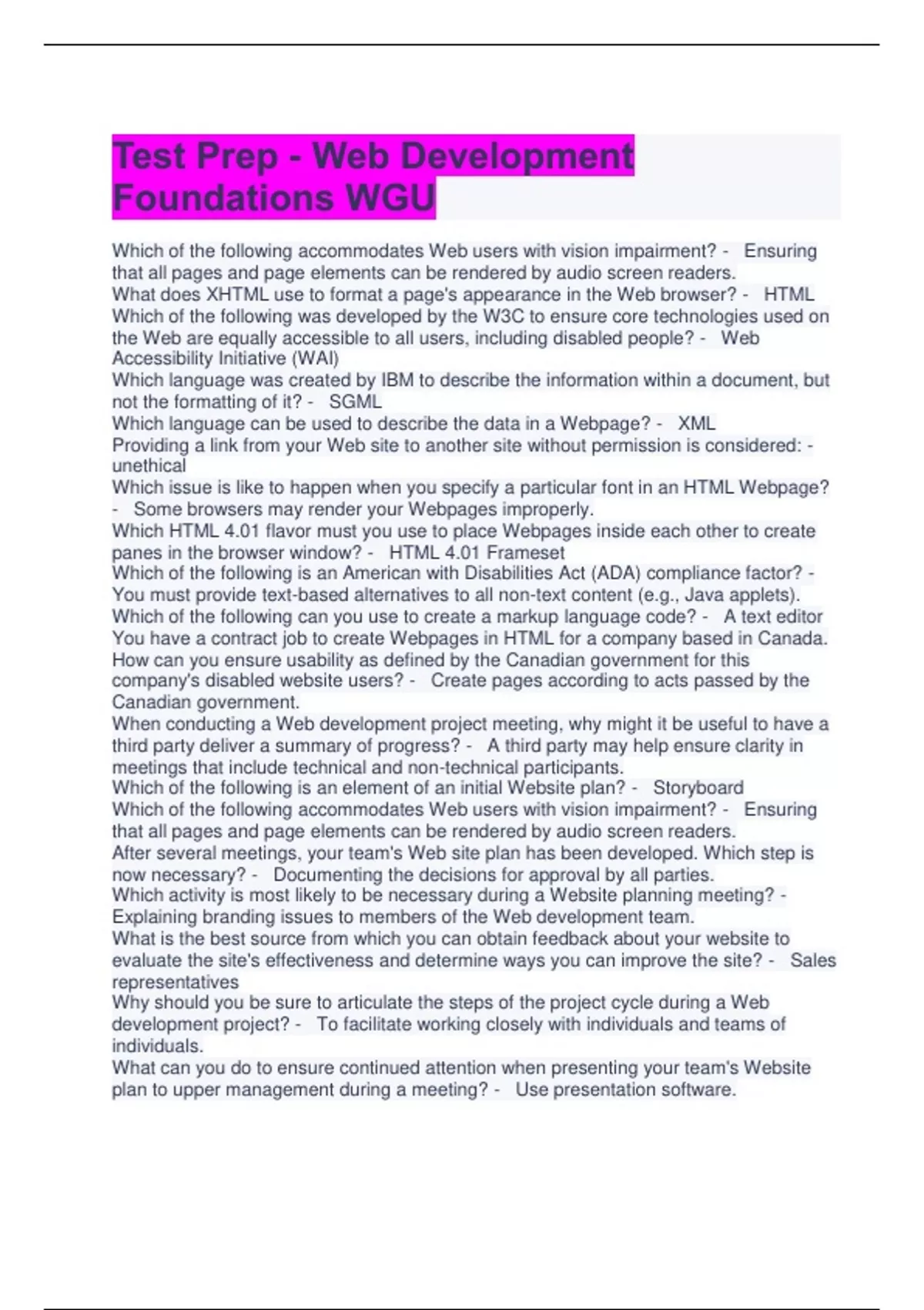 Test Prep - Web Development Foundations WGU Which of the following accommodates Web users with vision impairment? - Ensuring that all pages and page elements can be rendered by audio screen readers. What does XHTML use to format a page's appearance in the Web browser? - HTML Which of the following was developed by the W3C to ensure core technologies used on the Web are equally accessible to all users, including disabled people? - Web Accessibility Initiative (WAI) Which language was created by IBM to describe the information within a document, but not the formatting of it? - SGML Which language can be used to describe the data in a Webpage? - XML Providing a link from your Web site to another site without permission is considered: - unethical Which issue is like to happen when you specify a particular font in an HTML Webpage? - Some browsers may render your Webpages improperly. Which HTML 4.01 flavor must you use to place Webpages inside each other to create panes in the browser window? - HTML 4.01 Frameset Which of the following is an American with Disabilities Act (ADA) compliance factor? - You must provide text-based alternatives to all non-text content (e.g., Java applets). Which of the following can you use to create a markup language code? - A text editor You have a contract job to create Webpages in HTML for a company based in Canada. How can you ensure usability as defined by the Canadian government for this company's disabled website users? - Create pages according to acts passed by the Canadian government. When conducting a Web development project meeting, why might it be useful to have a third party deliver a summary of progress? - A third party may help ensure clarity in meetings that include technical and non-technical participants. Which of the following is an element of an initial Website plan? - Storyboard Which of the following accommodates Web users with vision impairment? - Ensuring that all pages and page elements can be rendered by audio screen readers. After several meetings, your team's Web site plan has been developed. Which step is now necessary? - Documenting the decisions for approval by all parties. Which activity is most likely to be necessary during a Website planning meeting? - Explaining branding issues to members of the Web development team. What is the best source from which you can obtain feedback about your website to evaluate the site's effectiveness and determine ways you can improve the site? - Sales representatives Why should you be sure to articulate the steps of the project cycle during a Web development project? - To facilitate working closely with individuals and teams of individuals. What can you do to ensure continued attention when presenting your team's Website plan to upper management during a meeting? - U