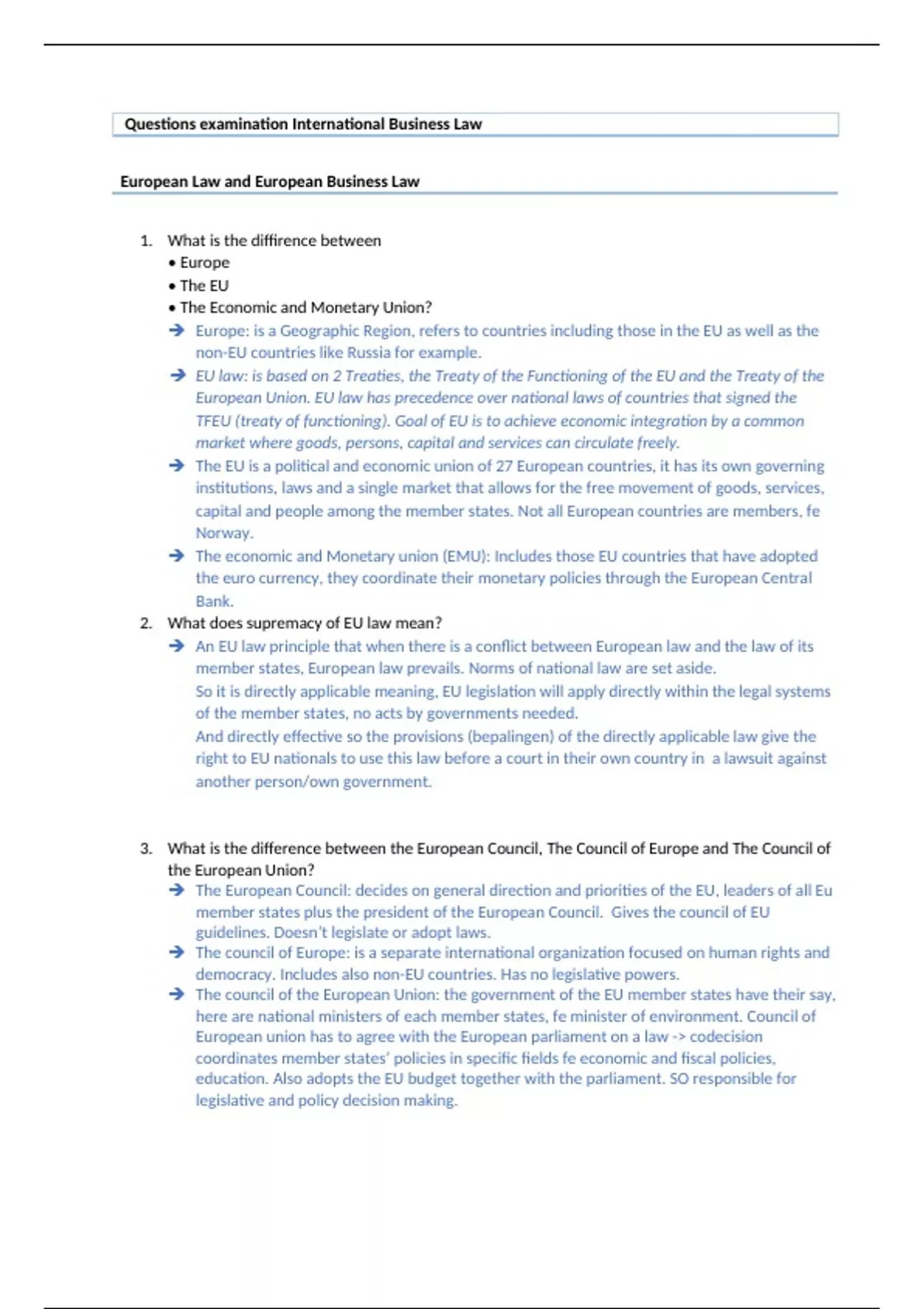 This is a document with all exam questions including answers for International Business law. Two topics are not complete but this is perhaps 10% of the document. The rest is complete.