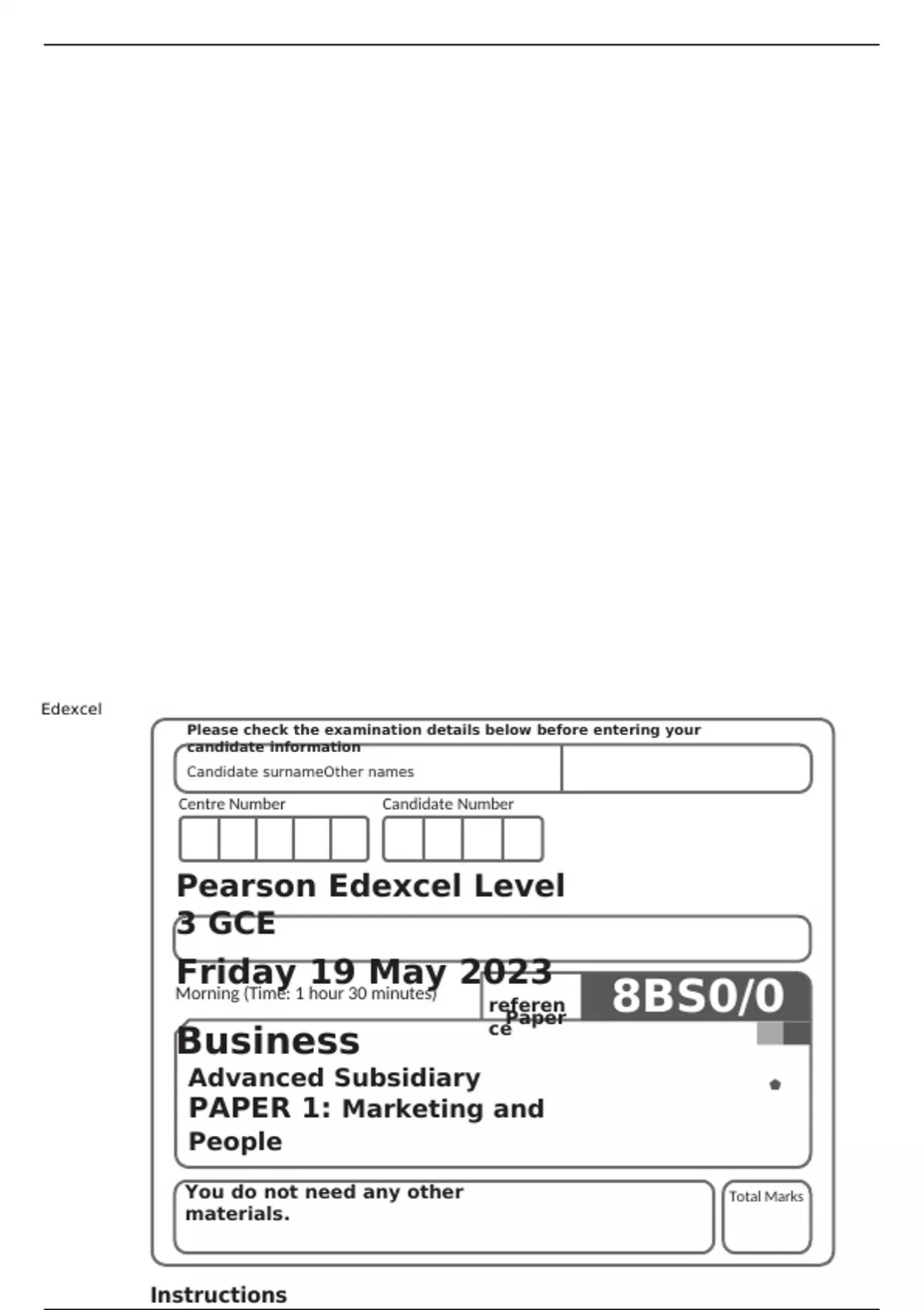 Pearson Edexcel Level 3 GCE Business Advanced Subsidiary PAPER 1 MAY 2023 QUESTION PAPER: Marketing and People
