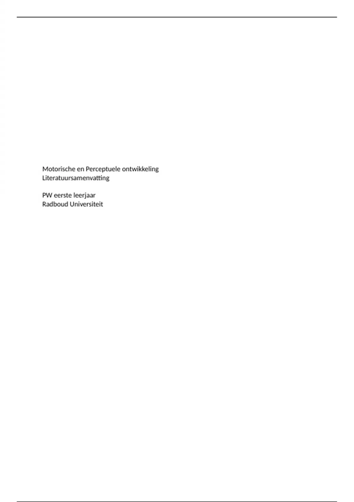 Goede en duidelijke samenvatting van de literatuur van het van Motorische en Perceptuele ontwikkeling. Het is een lastig tentamen, waarbij de literatuur van groot belang is. Daarom hierbij alles samengevat! :)