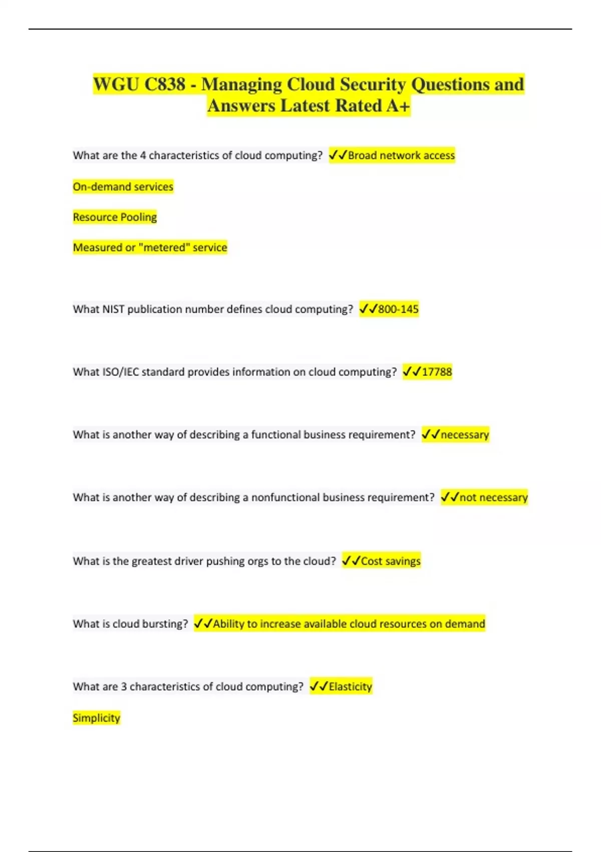 WGU C838 - Managing Cloud Security Questions and Answers Latest Rated A+ What are the 4 characteristics of cloud computing? Broad network access On-demand services Resource Pooling Measured or "metered" service What NIST publication number defines cloud computing? 800-145 What ISO/IEC standard provides information on cloud computing? 17788 What is another way of describing a functional business requirement? necessary What is another way of describing a nonfunctional business requirement? not necessary What is the greatest driver pushing orgs to the cloud? Cost savings What is cloud bursting? Ability to increase available cloud resources on demand What are 3 characteristics of cloud computing? Elasticity Simplicity